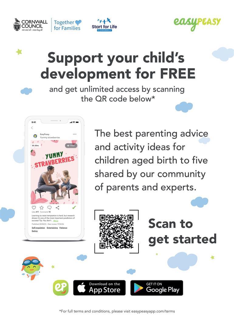 Cornwall Council is excited to offer you free, premium access to EasyPeasy – an app full of parenting tips, advice and activities for you and your 0-5 year old. It’s full of top tips, advice and play