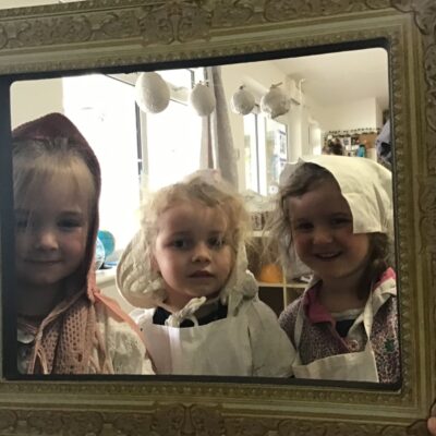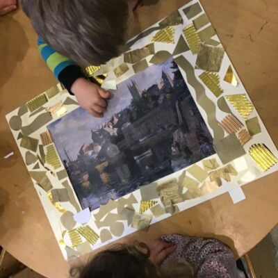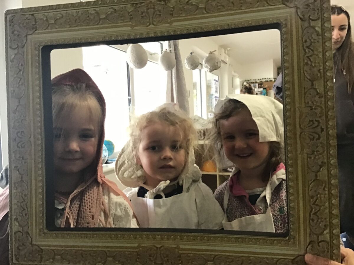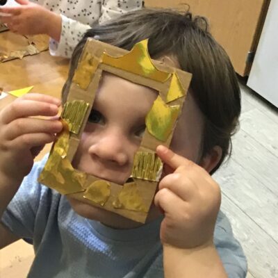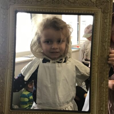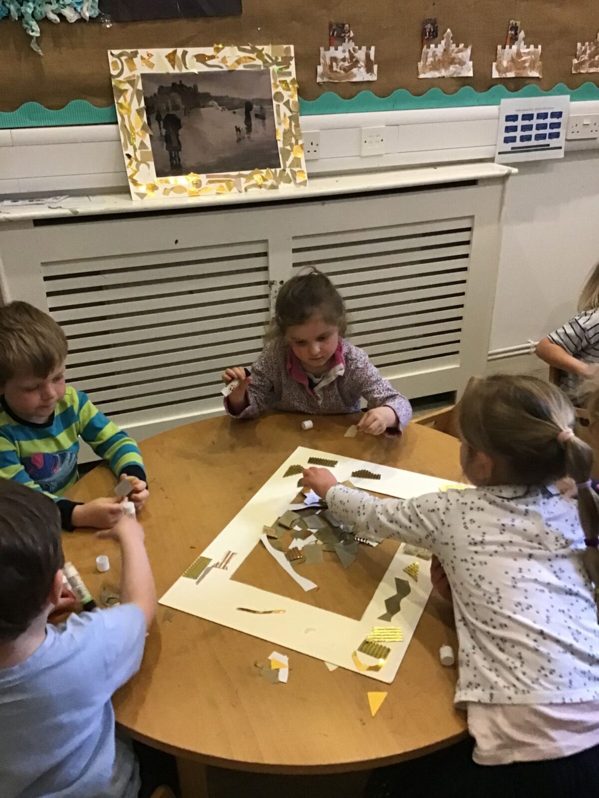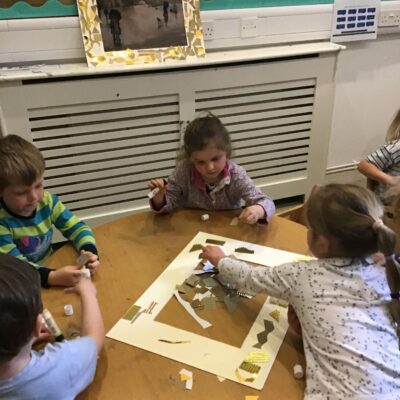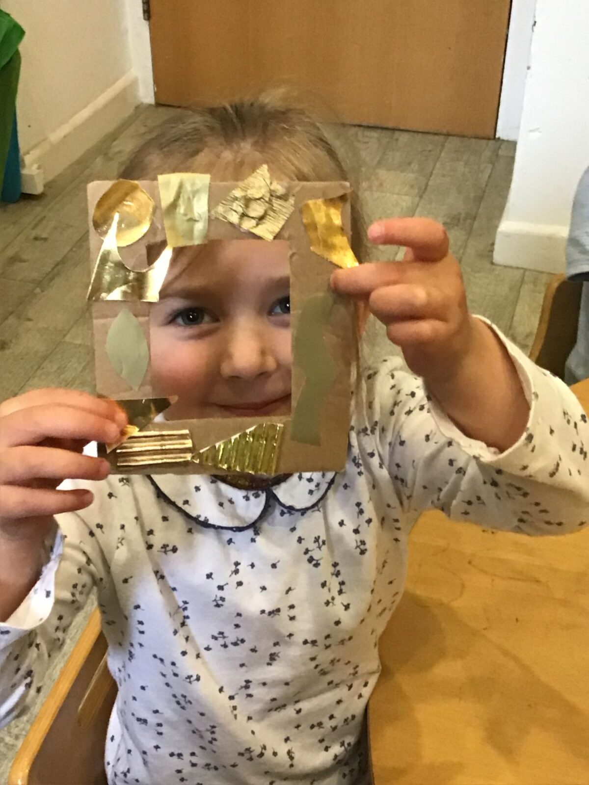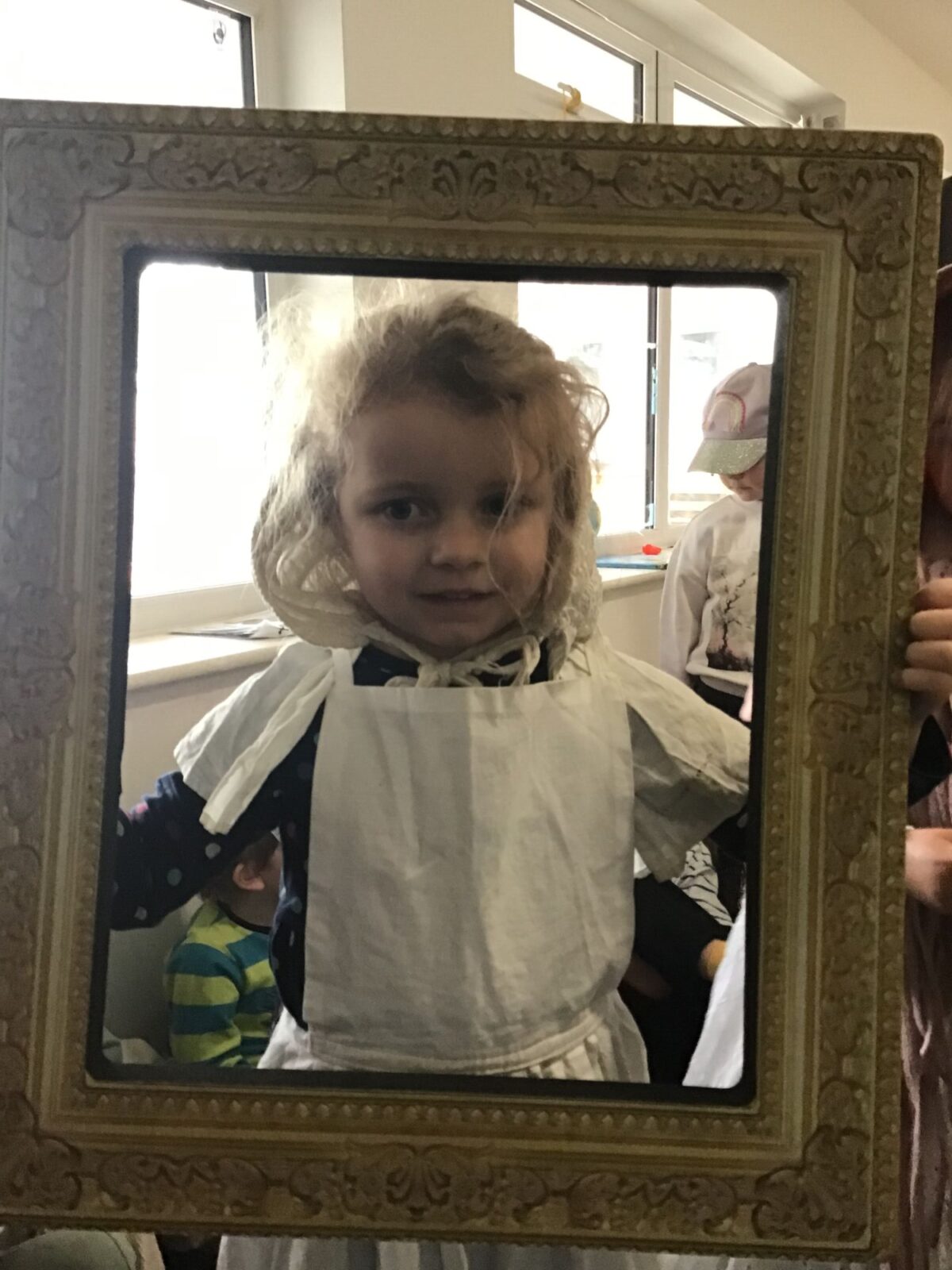 The children got stuck in to their crafting activity, creating individual golden collage picture frames, they were talking about the different shapes, spotting semi circles and lots of other shapes! They then worked together to create group collage frames too! After this the children looked at an old painting of school children and had opportunity to dress up in Victorian style clothing. Some of the children jumped at this chance and others enjoyed looking through the items in the dressing up box.