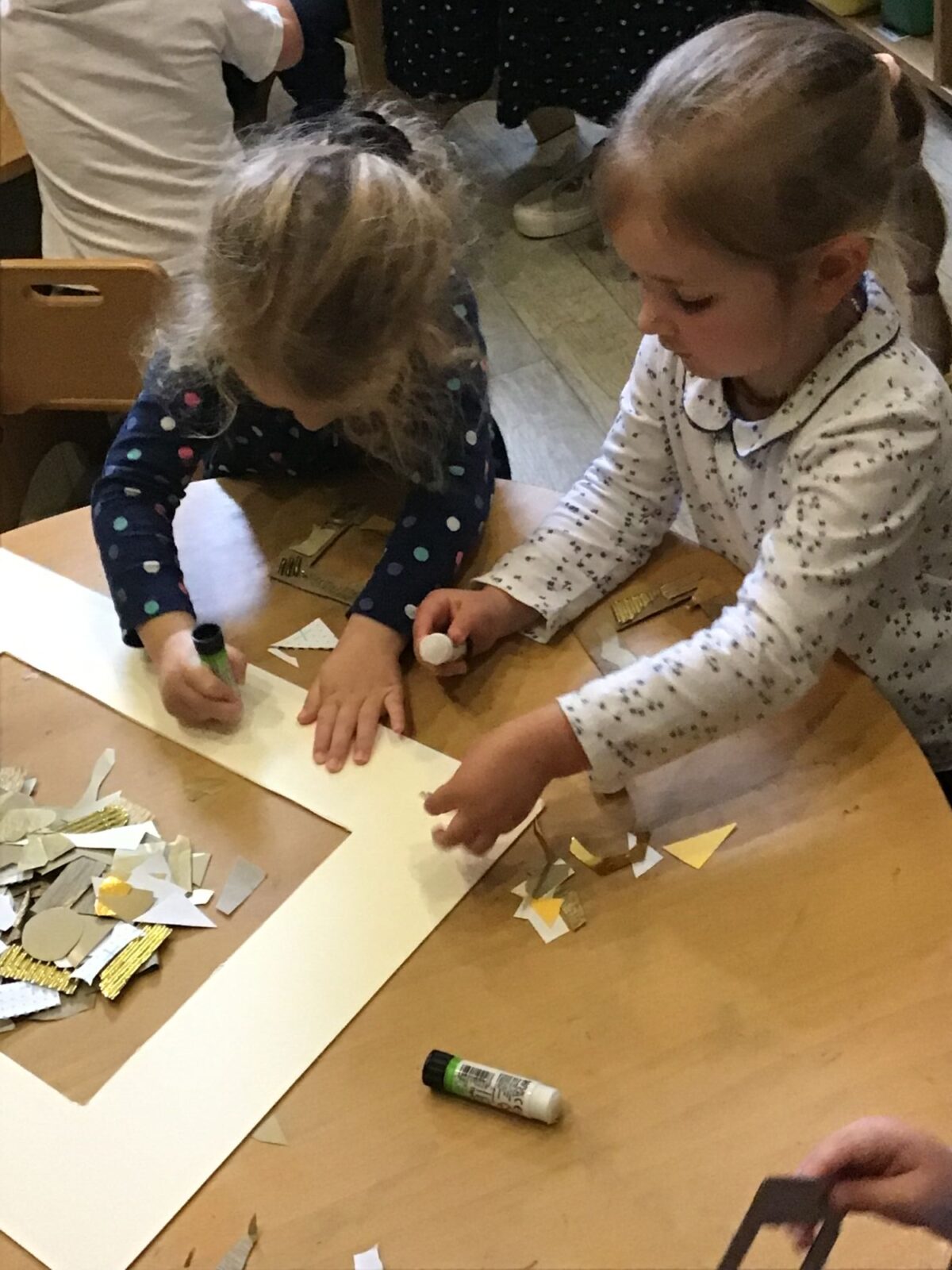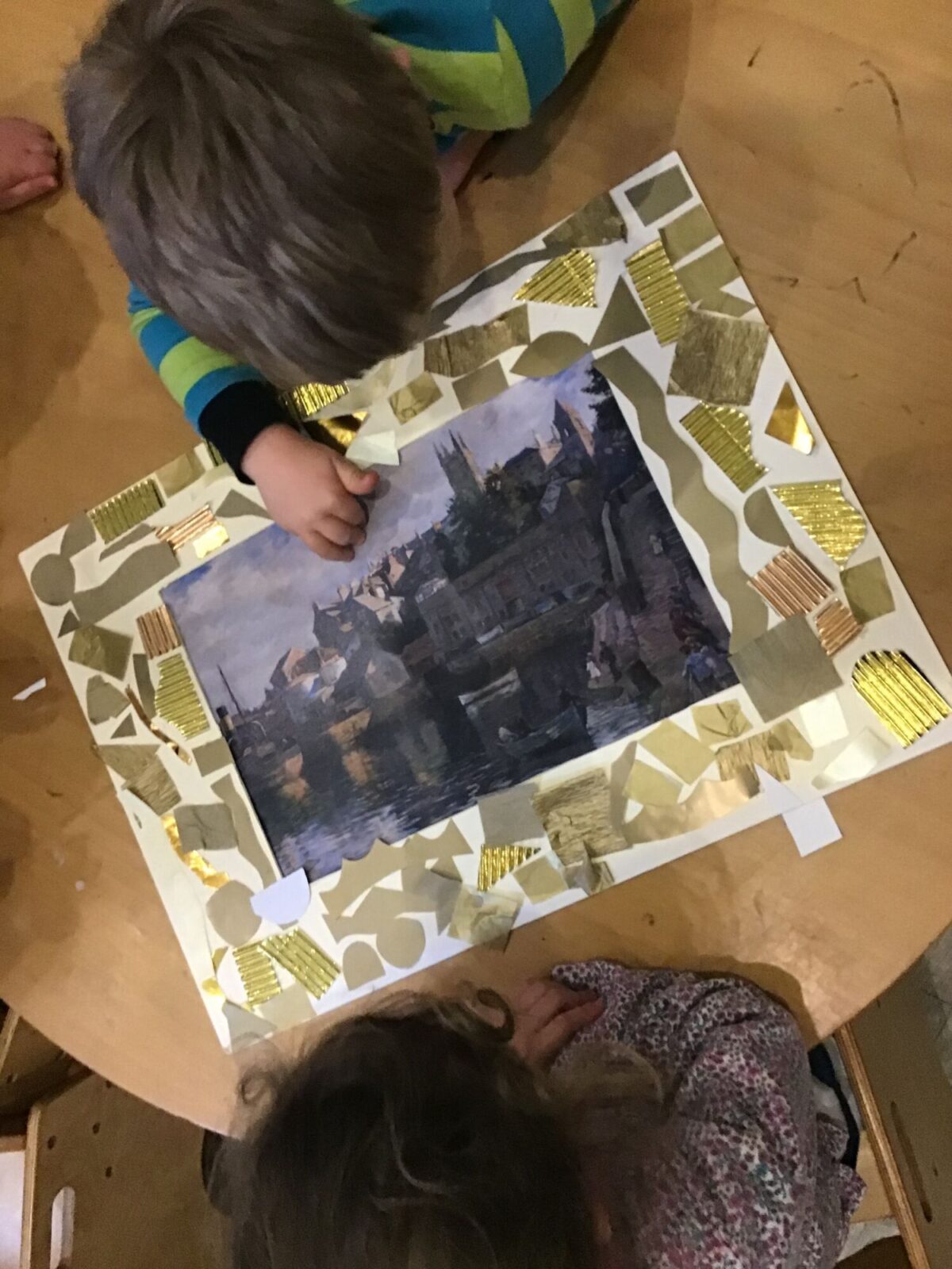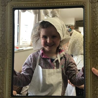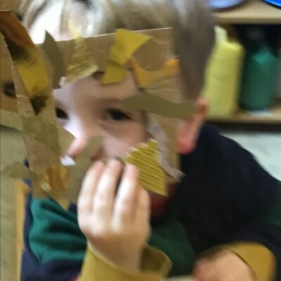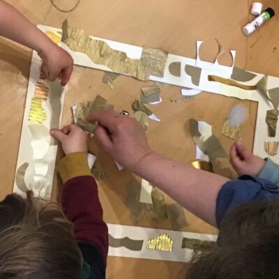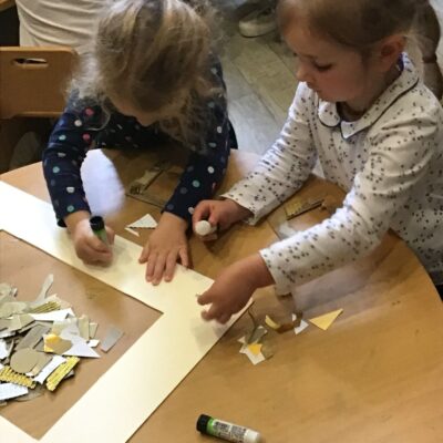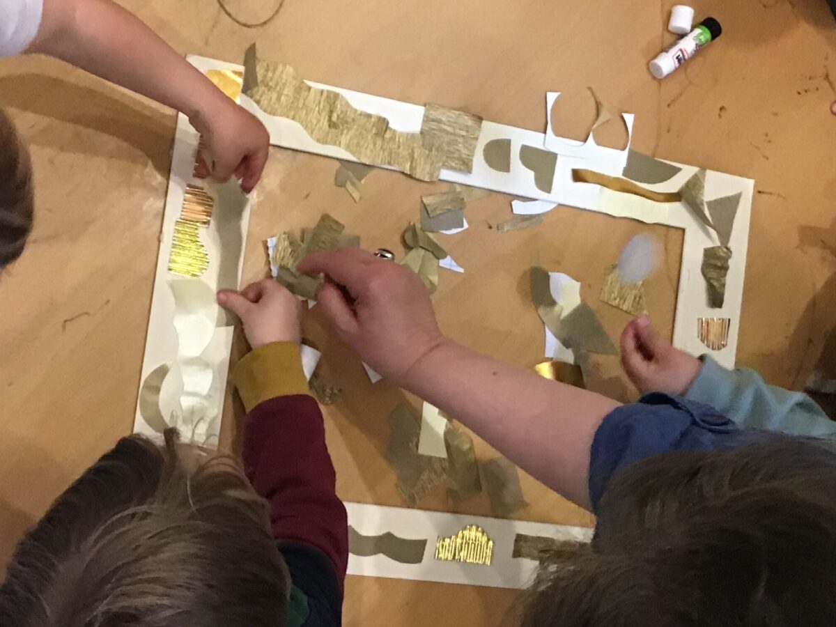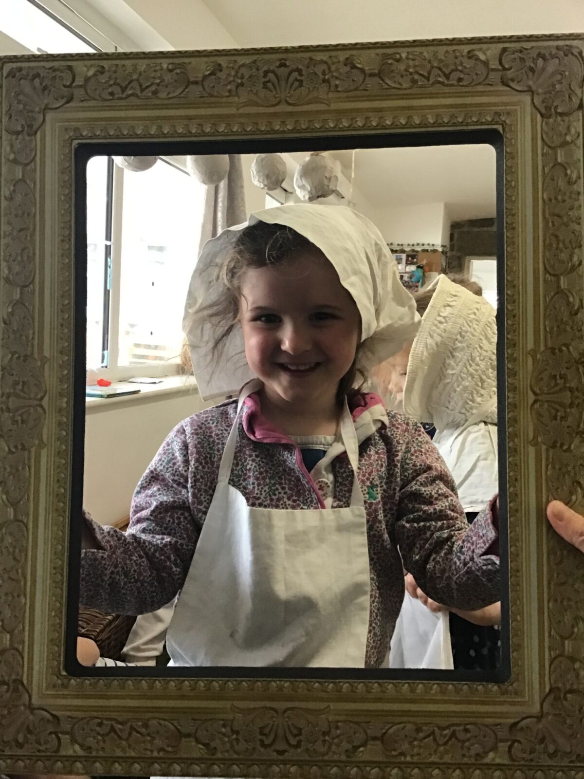 The children got stuck in to their crafting activity, creating individual golden collage picture frames, they were talking about the different shapes, spotting semi circles and lots of other shapes! They then worked together to create group collage frames too! After this the children looked at an old painting of school children and had opportunity to dress up in Victorian style clothing. Some of the children jumped at this chance and others enjoyed looking through the items in the dressing up box.