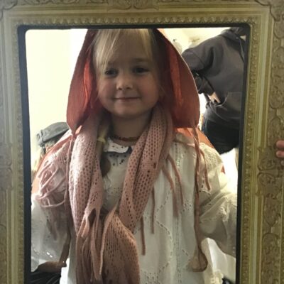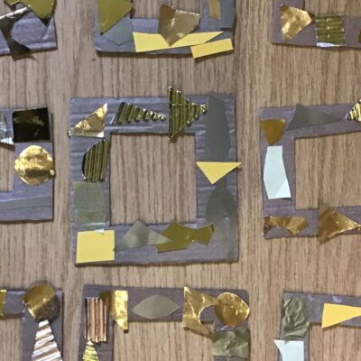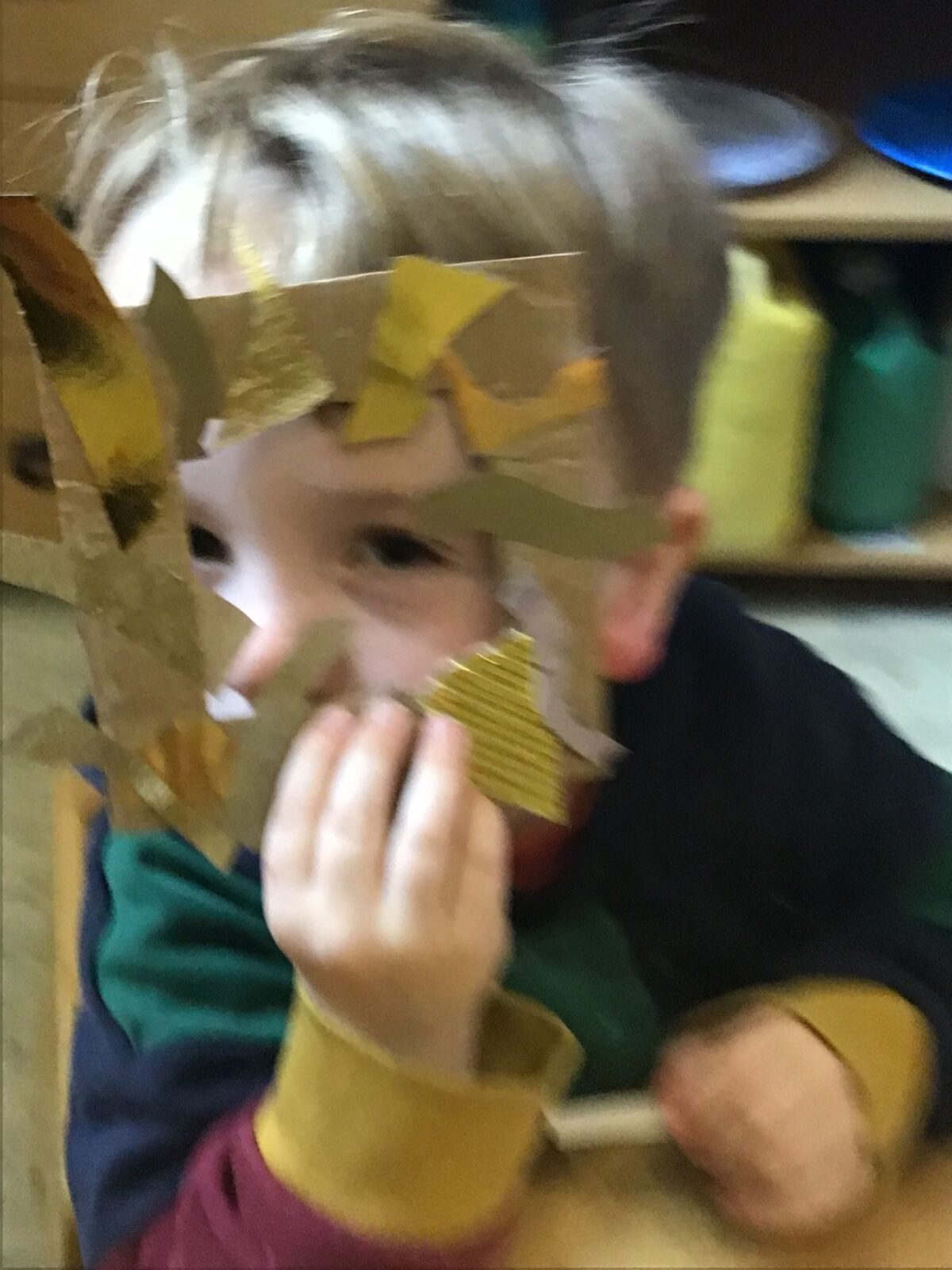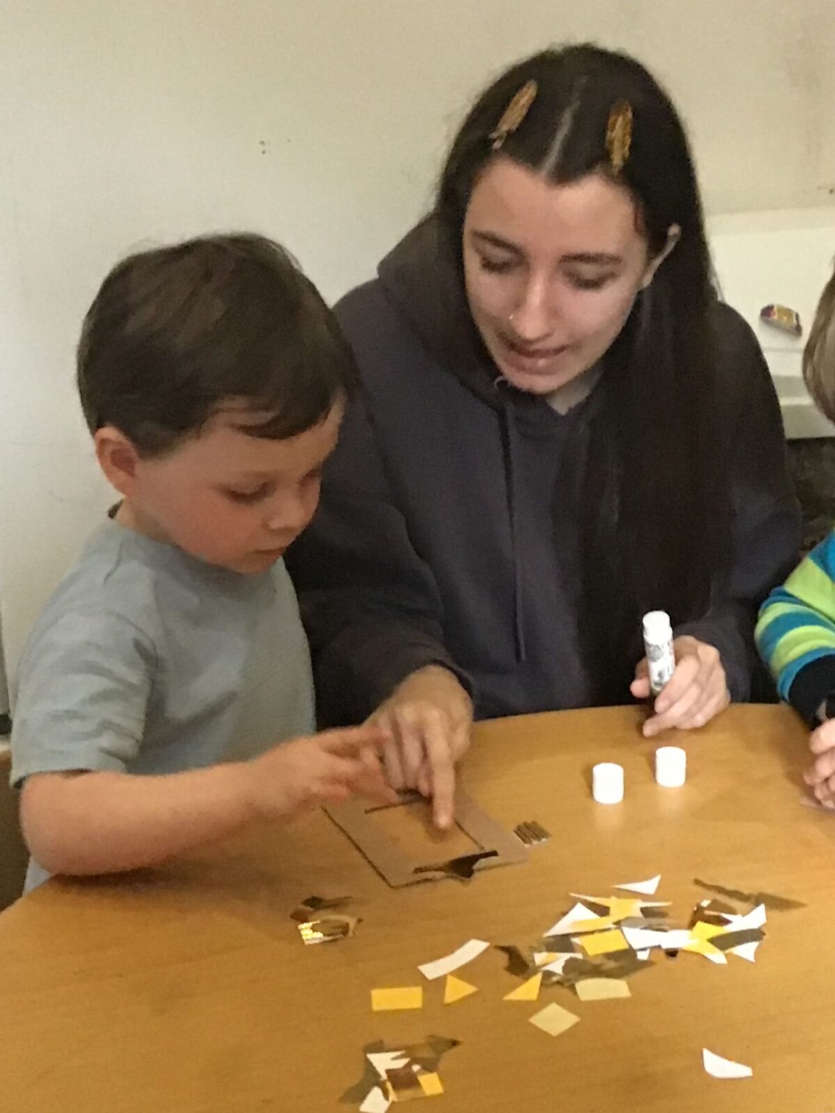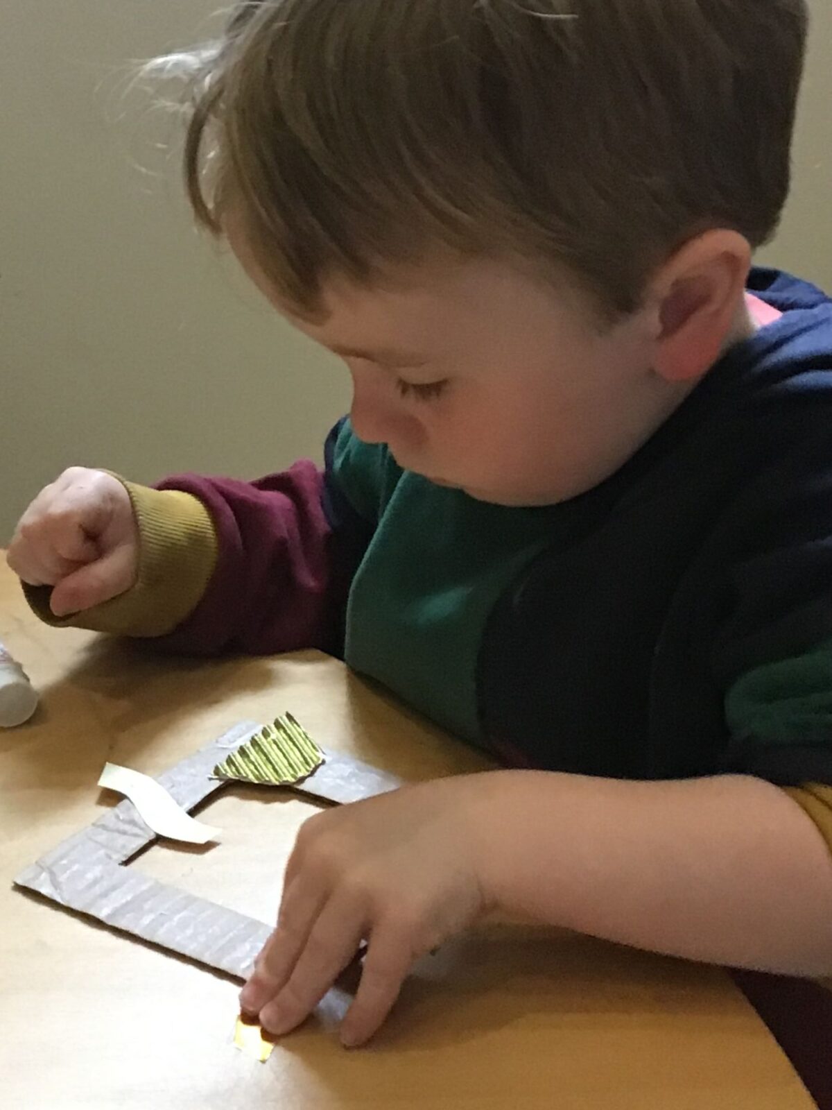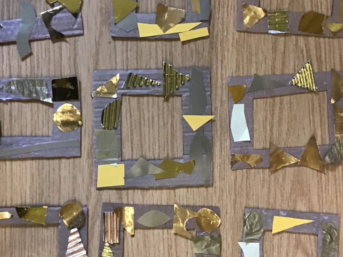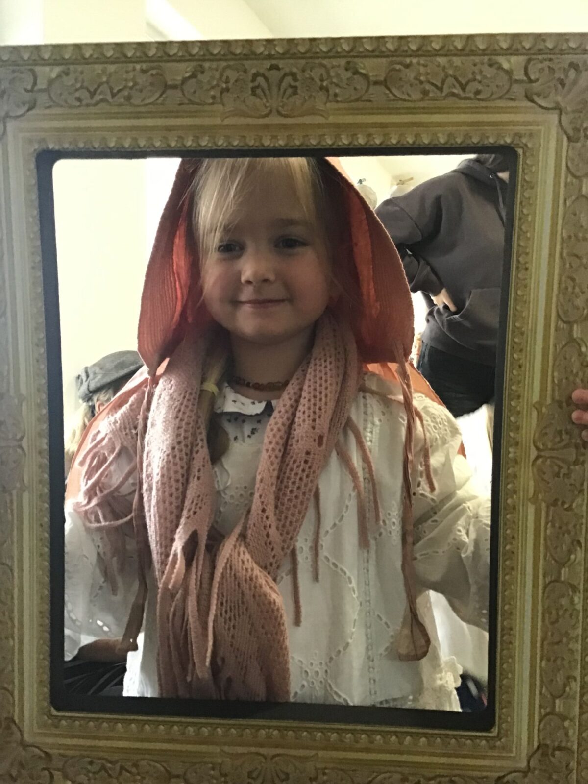 The children got stuck in to their crafting activity, creating individual golden collage picture frames, they were talking about the different shapes, spotting semi circles and lots of other shapes! They then worked together to create group collage frames too! After this the children looked at an old painting of school children and had opportunity to dress up in Victorian style clothing. Some of the children jumped at this chance and others enjoyed looking through the items in the dressing up box.