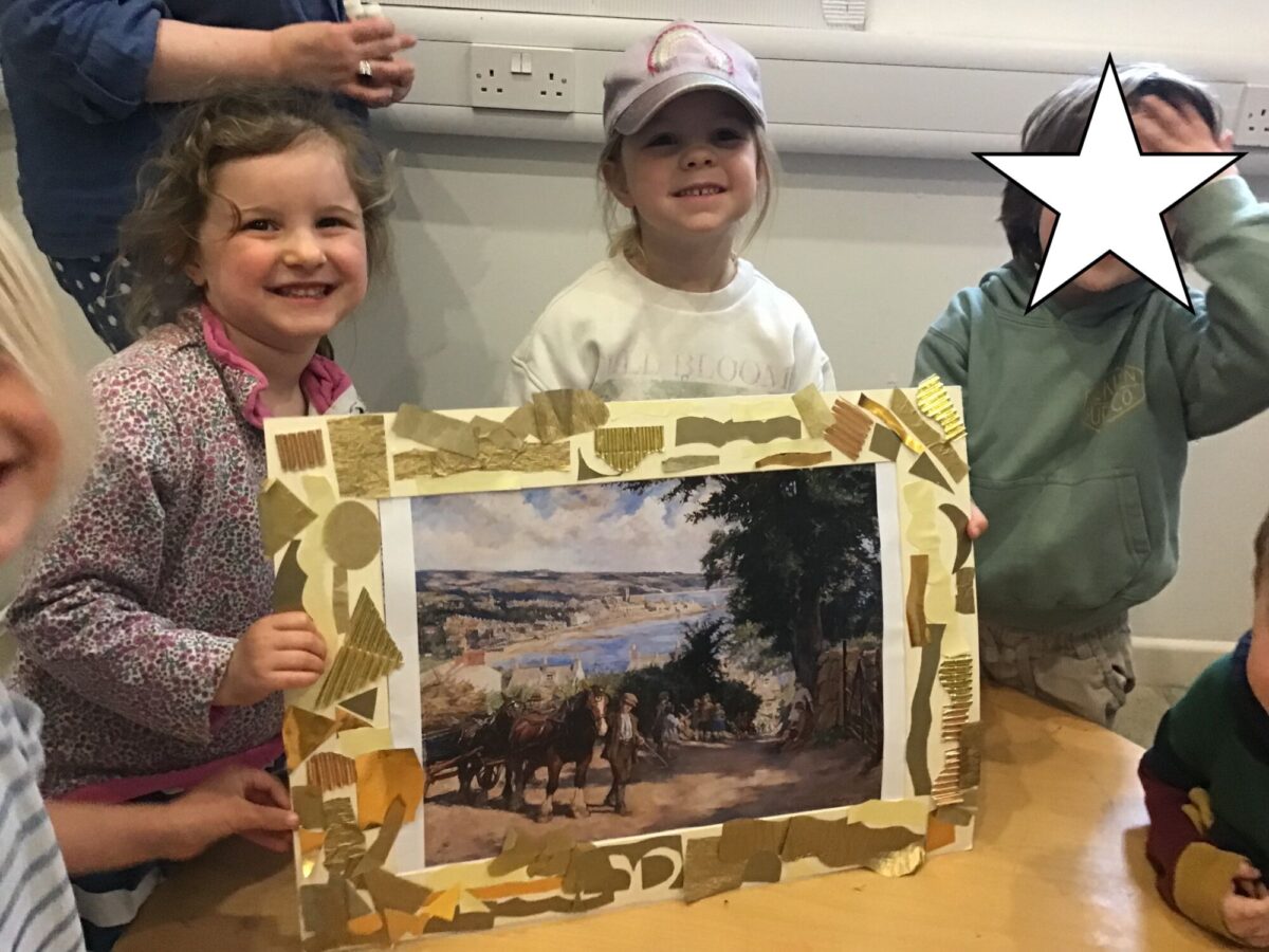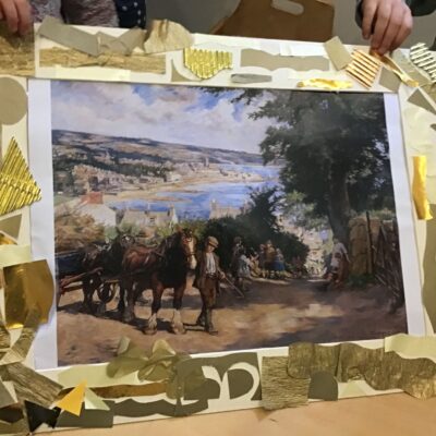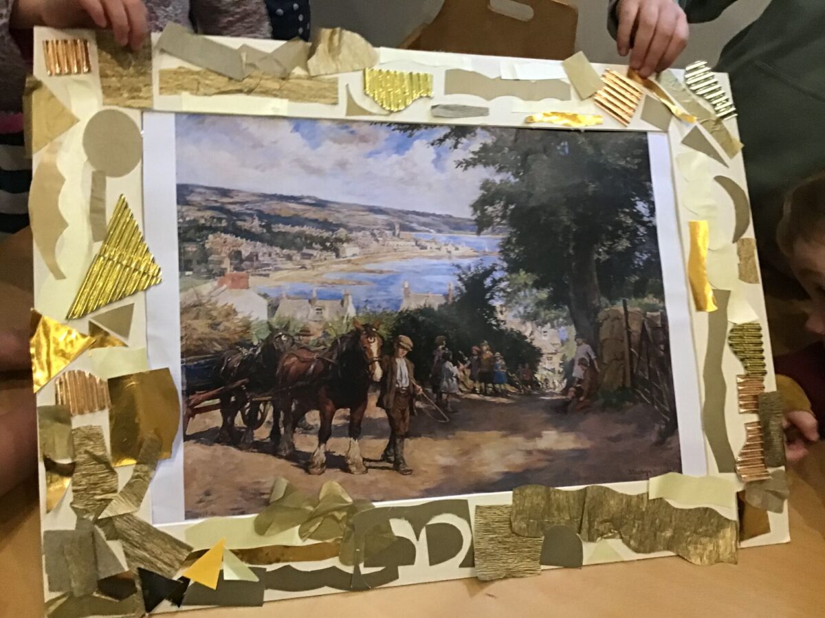 Katie and Jo then gave the children clues to help them remember the old and new items we’d previously explored and the children knew what they were instantly and were talking about them in even more detail, adding the materials that they were made out of for example. All of the children particularly love the ‘Granny Grace’ painting and enthusiastically remembered all about how she didn’t have any electricity and used candles and ceramic hot water bottles. They showed brilliant observational skills when looking at new paintings, for example spotting St Mary’s church from different angles in 3 different paintings, spotting similarities and differences in clothing and suchlike.