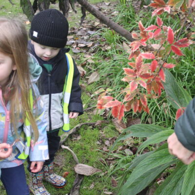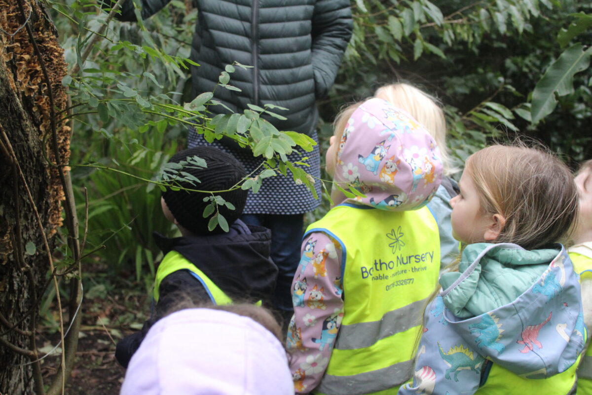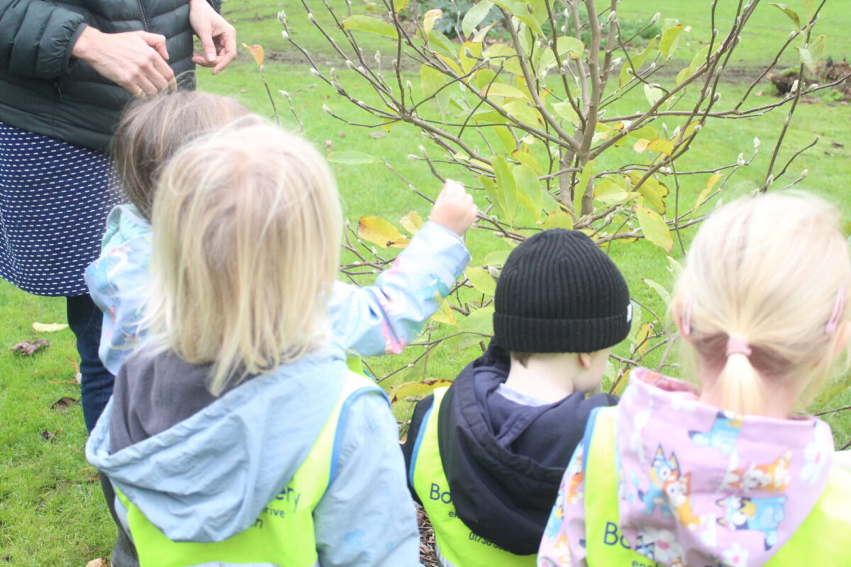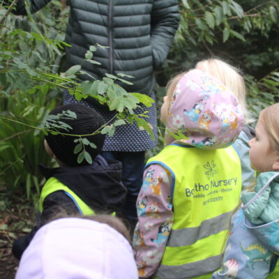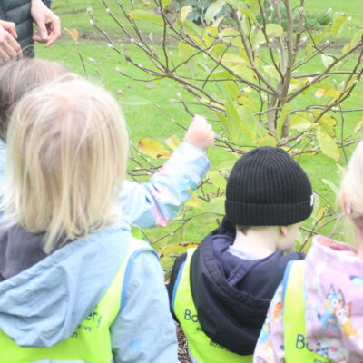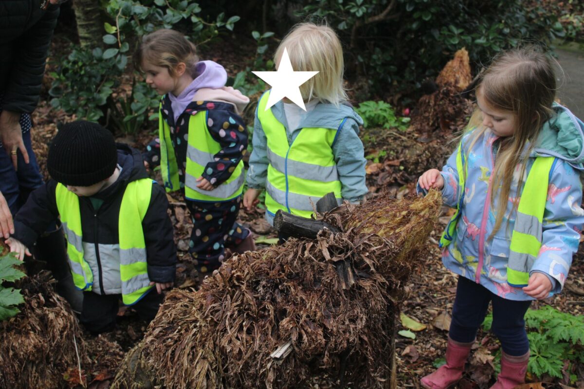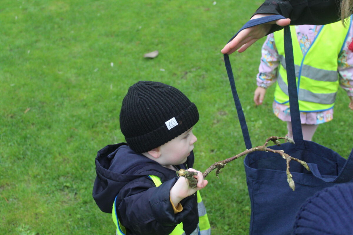Along the way the children were looking for details in the natural environment, things such as cobwebs behind the bark in the trees and different shapes and colours in the plants. There were some cut down plants that the children thought looked like pigs! Near the fountain we saw foot prints in the mud and the children showed curiosity wondering what may have made the prints. On our way back to the gardeners house we stopped and looked at the ‘looking tree’ which has nodules that look like eyes which is how it gets it’s name! Outside the gardener’s house we looked at the textures on the plants in the sensory garden and the mosaic tiles too. The children showed lots of curiosity and asked brilliant questions.