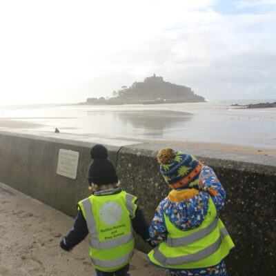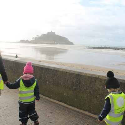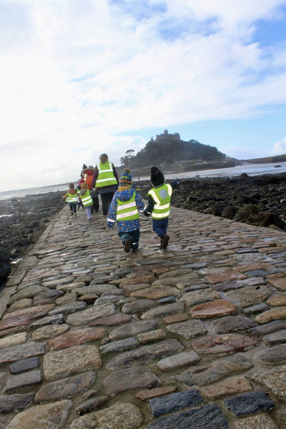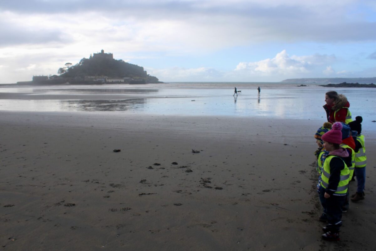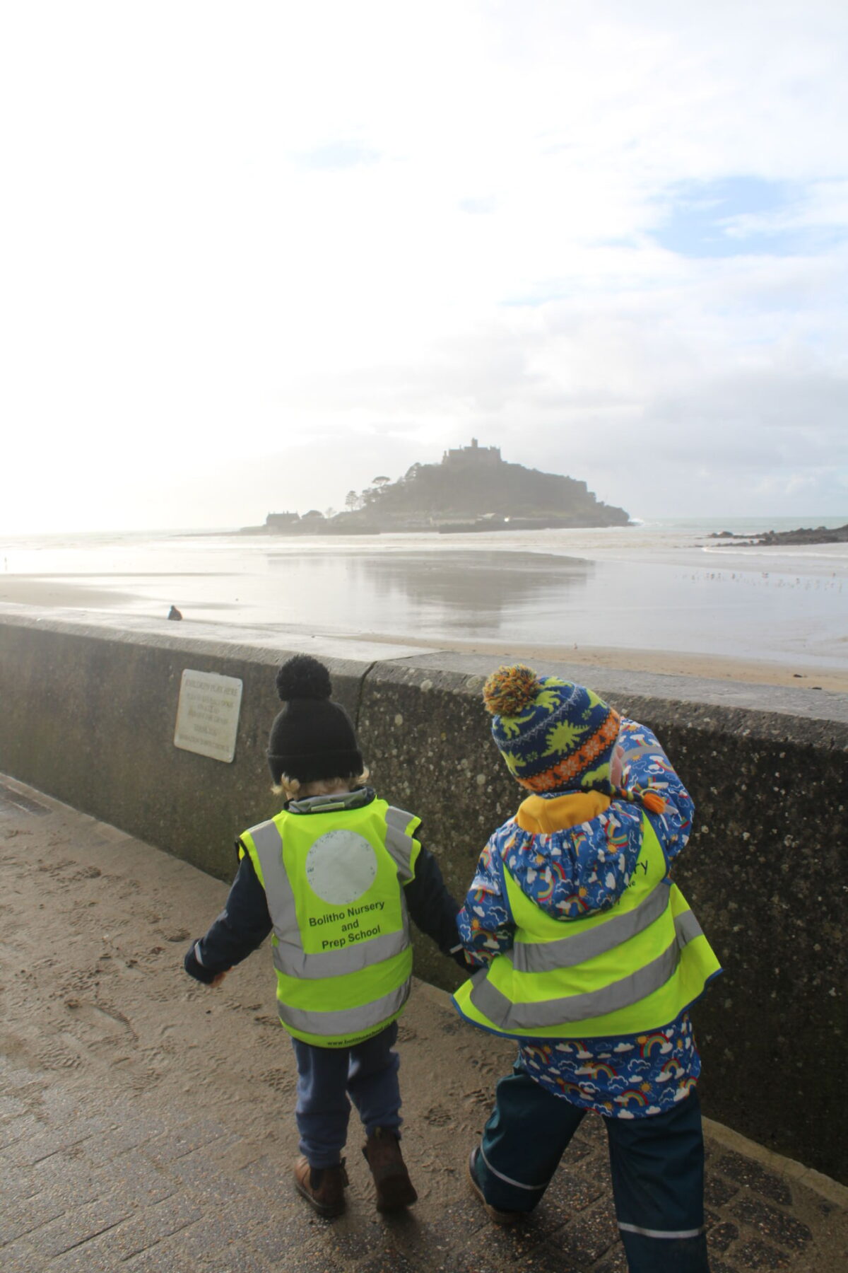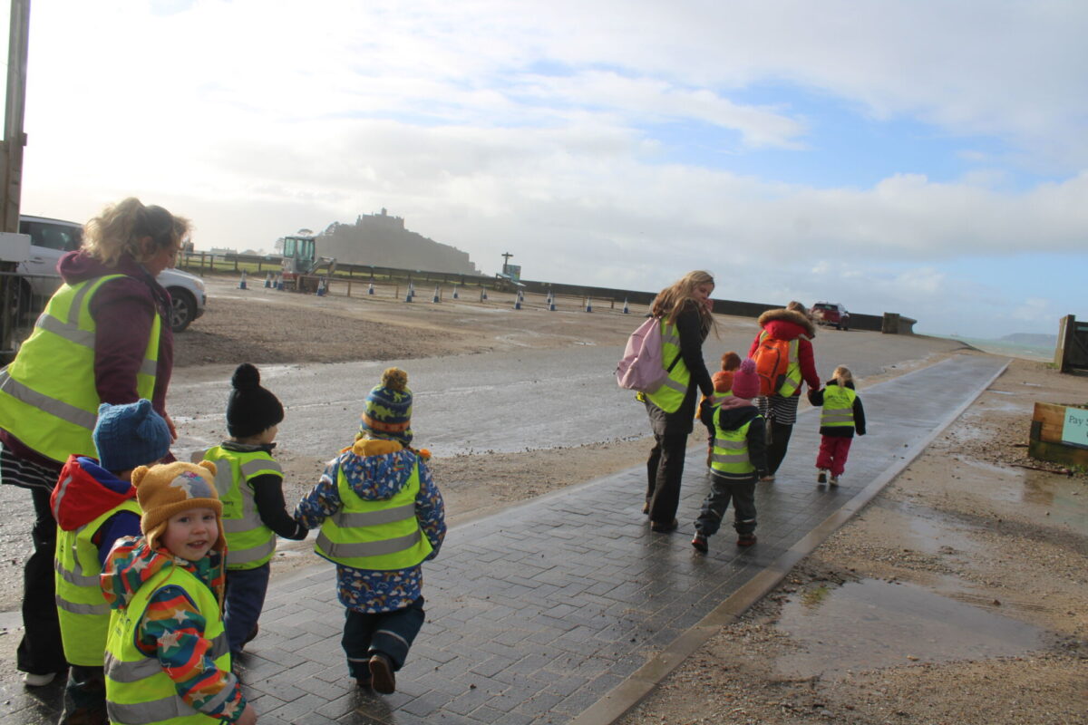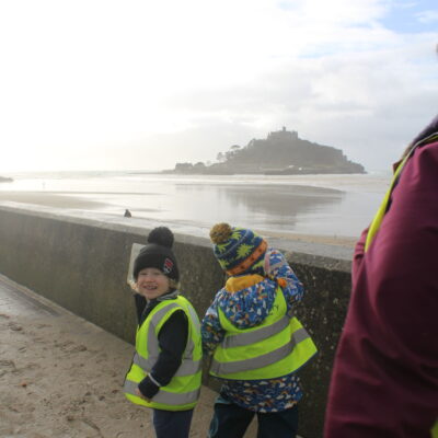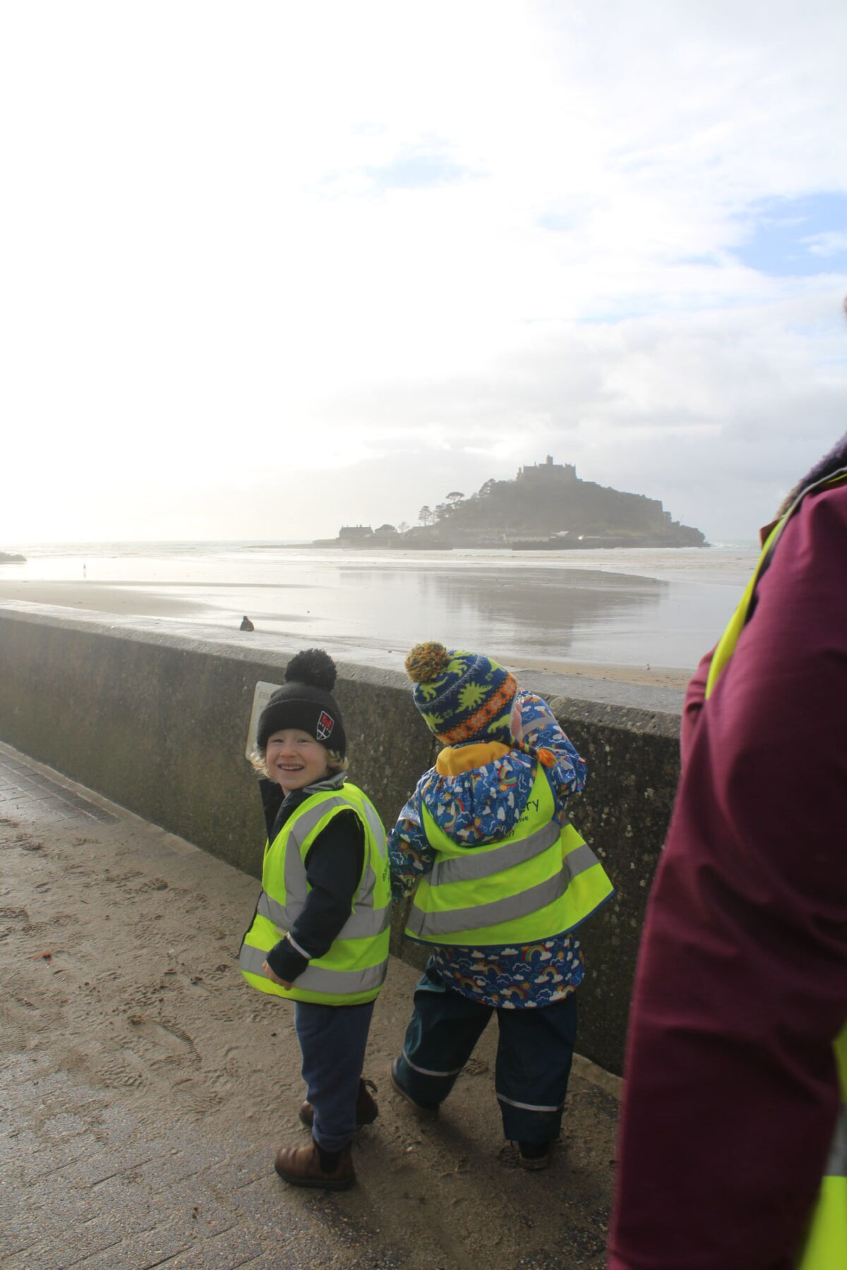 We started our adventure today with a walk from the nursery to Penzance bus station where we catch the number 2 bus to Marazion! The children were excited to spot the sights on the way from looking out the bus window. They loved pressing the button to request the bus stopped at our stop. They were very polite saying thank you to the bus driver as we got off the bus. We then spotted the mount as we walked towards the causeway!