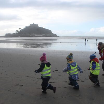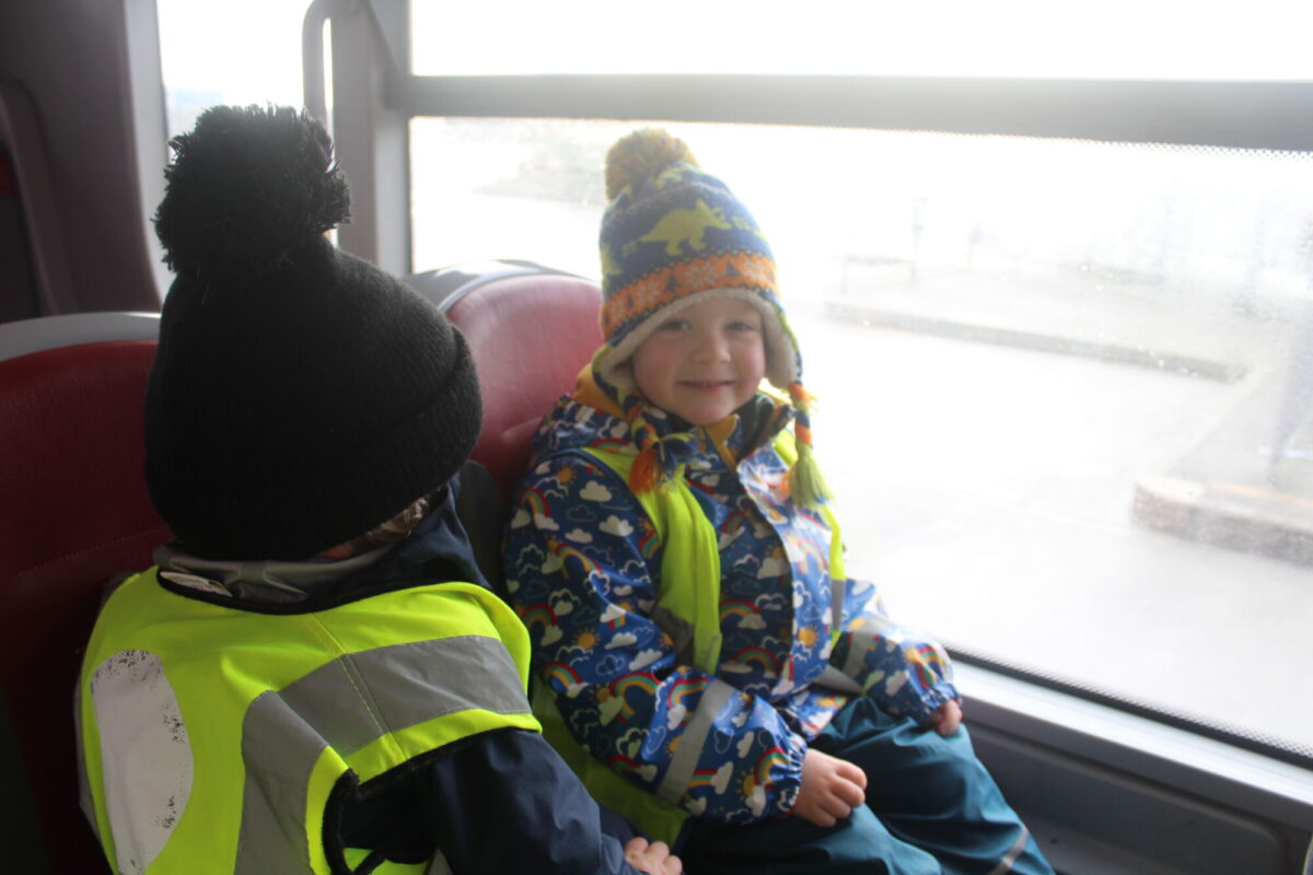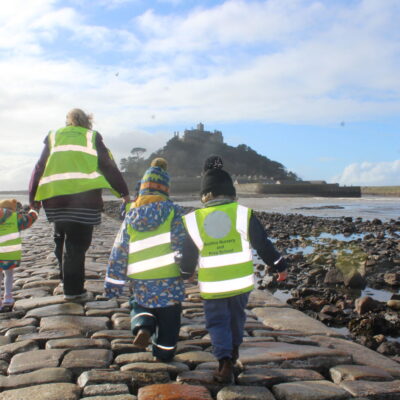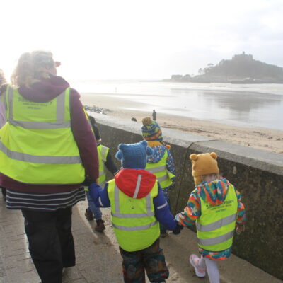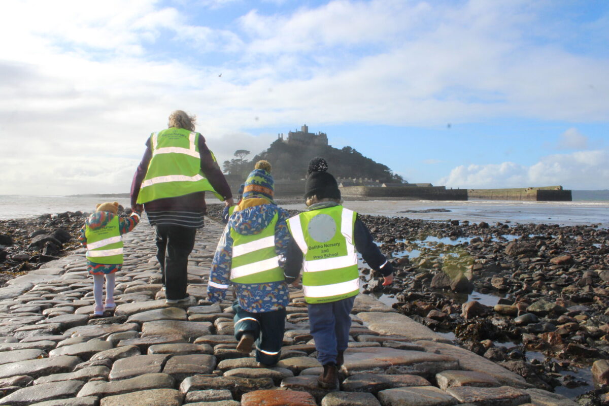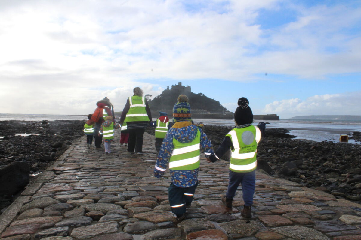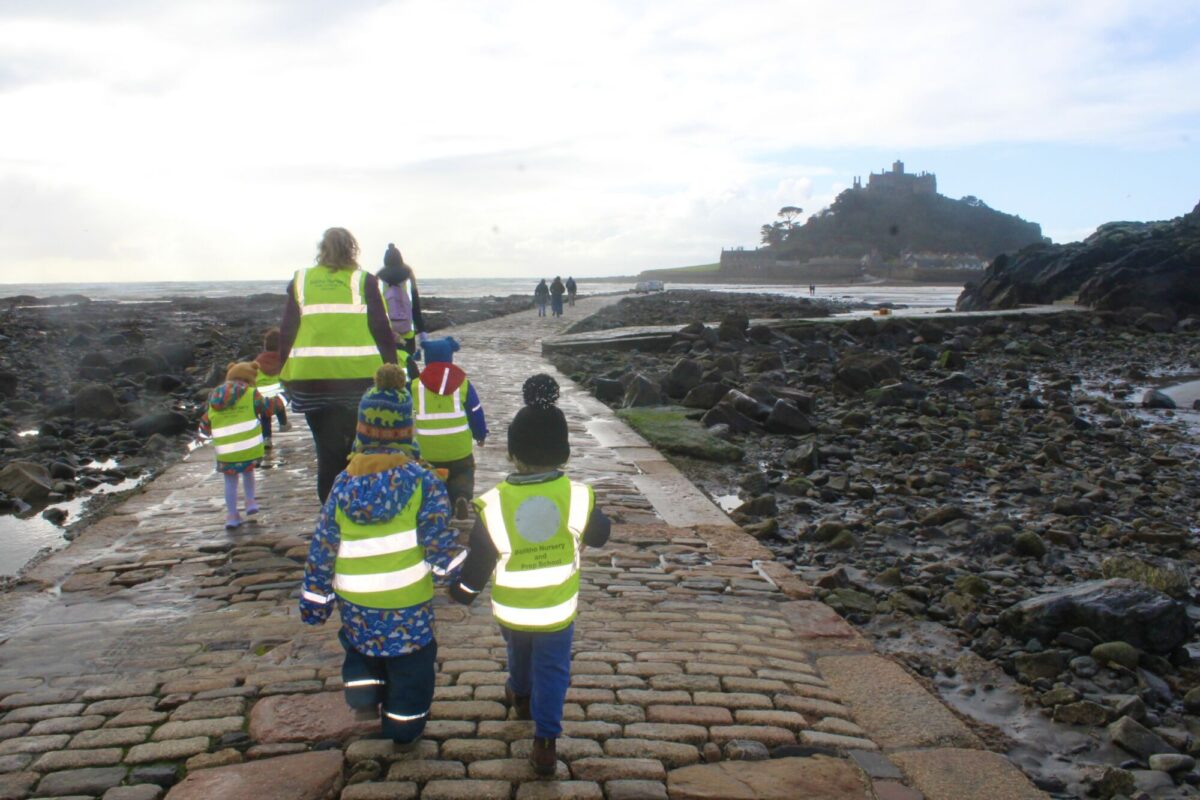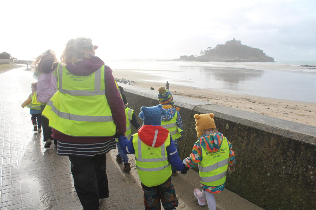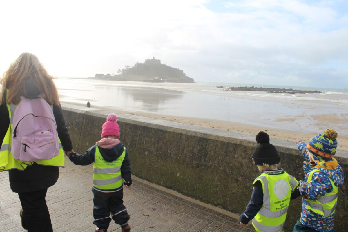 We started our adventure today with a walk from the nursery to Penzance bus station where we catch the number 2 bus to Marazion! The children were excited to spot the sights on the way from looking out the bus window. They loved pressing the button to request the bus stopped at our stop. They were very polite saying thank you to the bus driver as we got off the bus. We then spotted the mount as we walked towards the causeway!