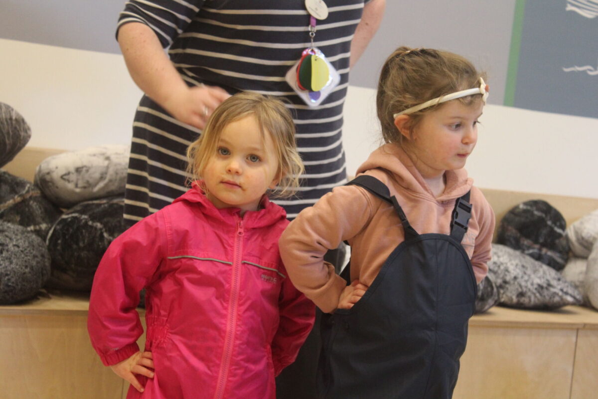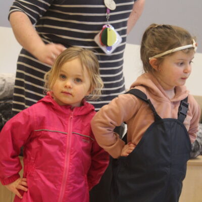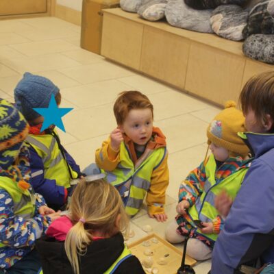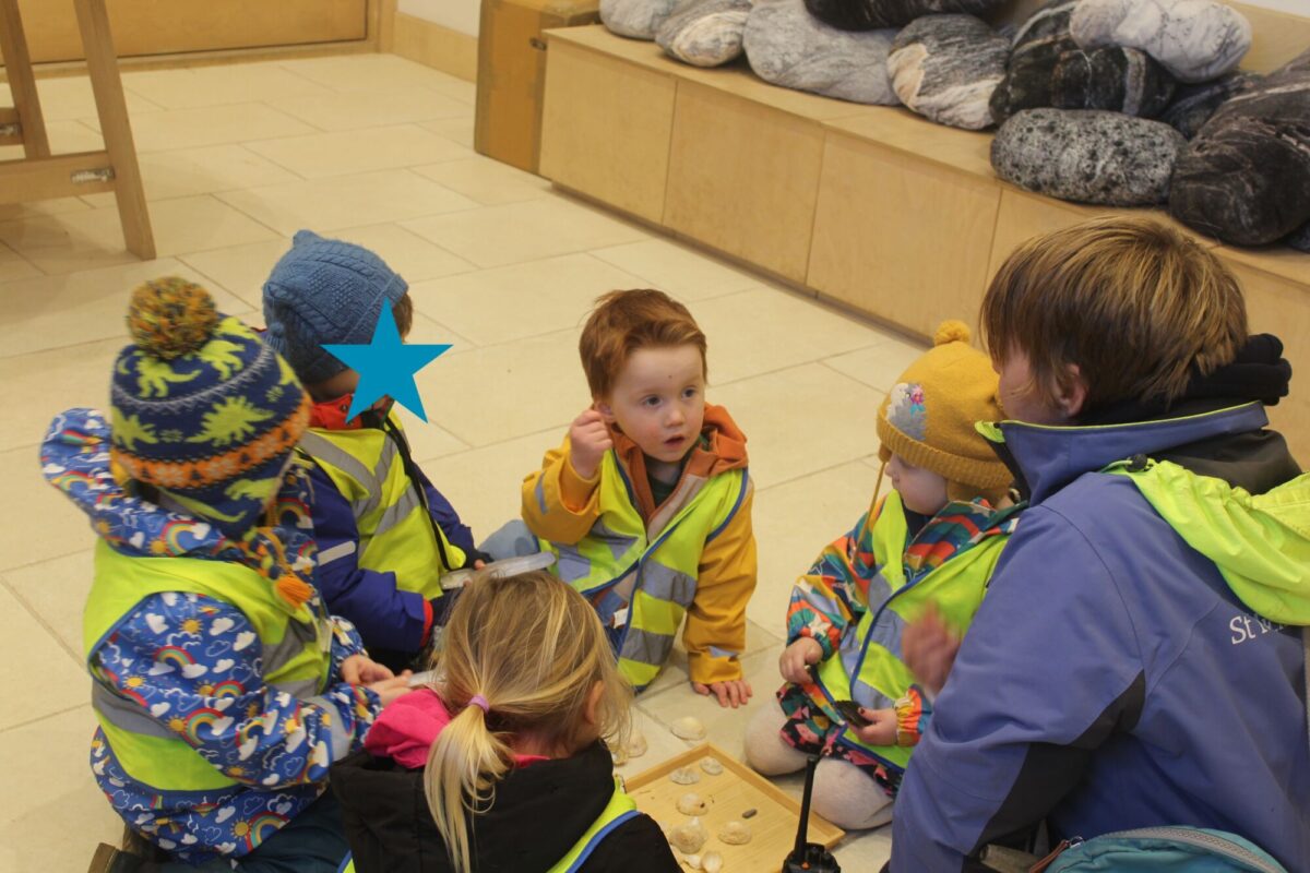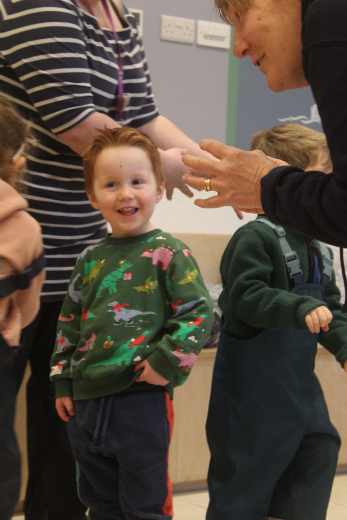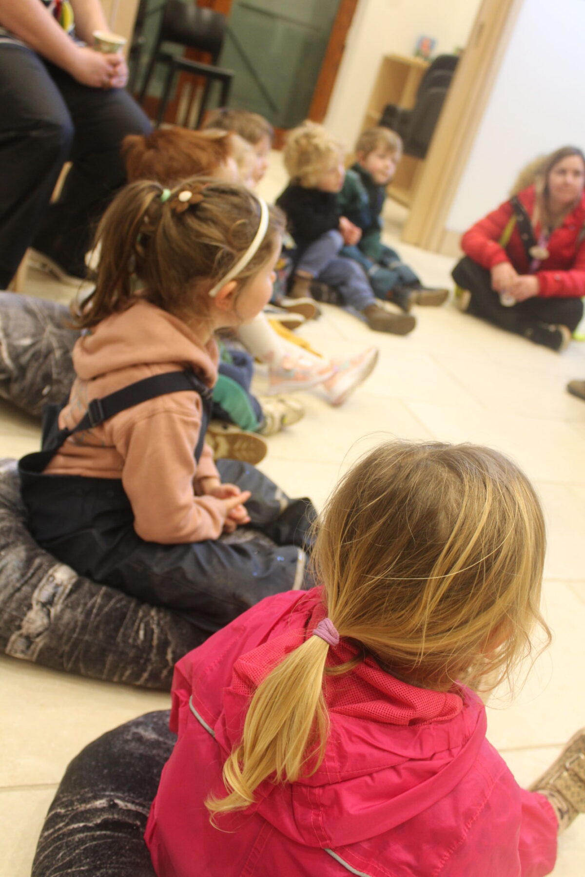 Next we went to the learning hub where we were treated to an oat milk hot chocolate which was delicious! After this Kerry told us the story of Cormoran the giant and the children joined in with actions (including making bunny ears that showed numbers!) and we even acted out the story when Kerry told it to us for a second time! They were fantastic actors and actresses! Kerry handed around Jack’s horn to show the children and they handled it very carefully and she blew it gently and the sound mesmerised the children.