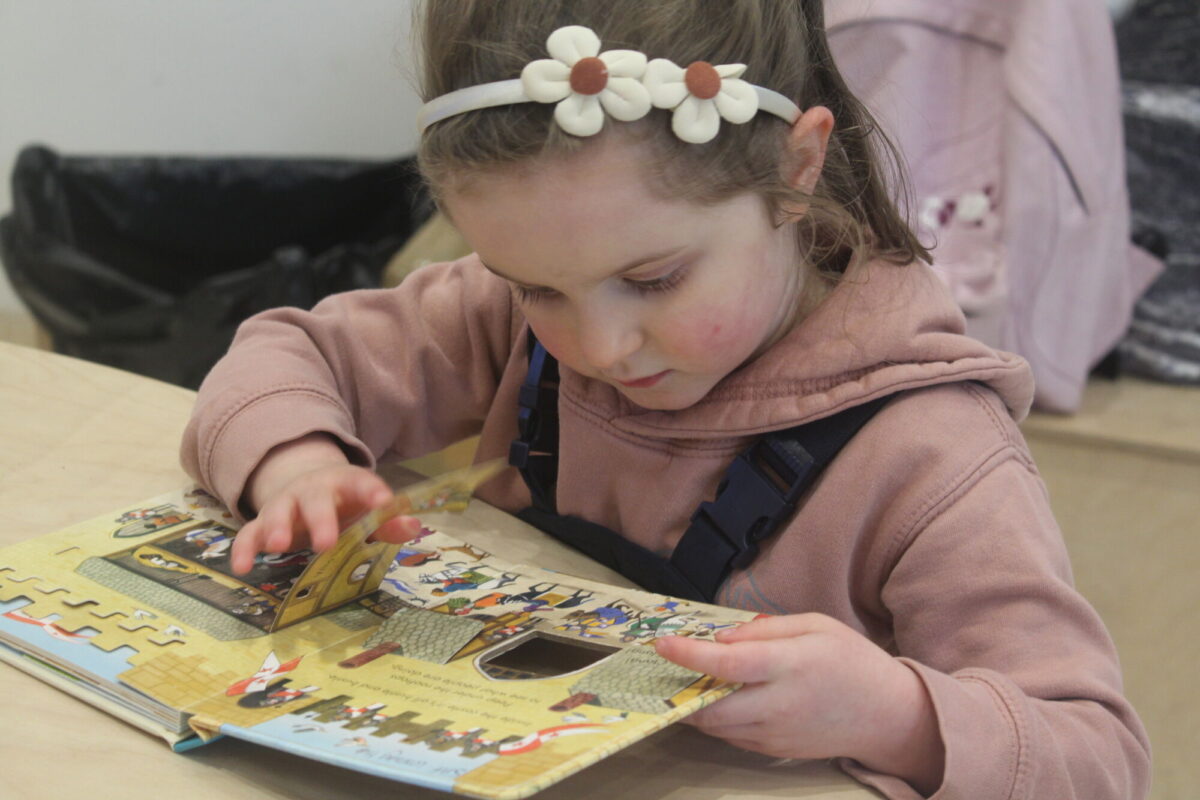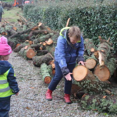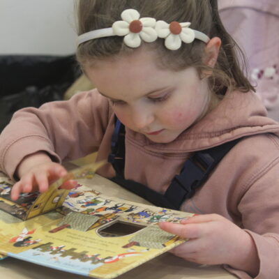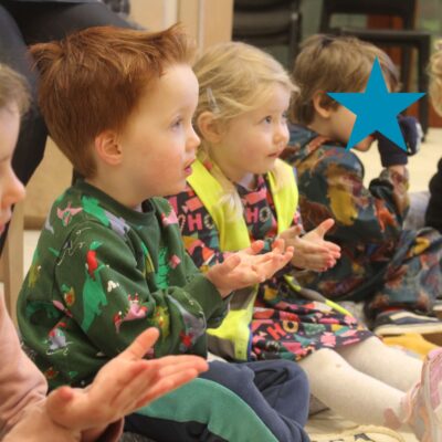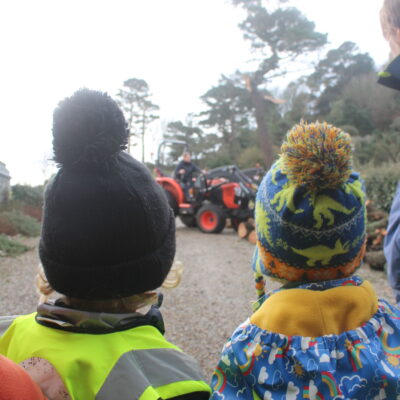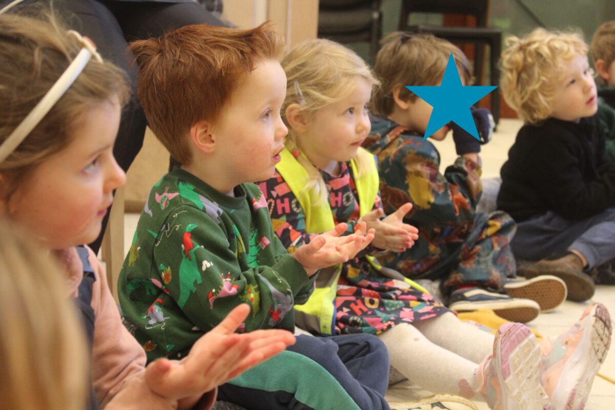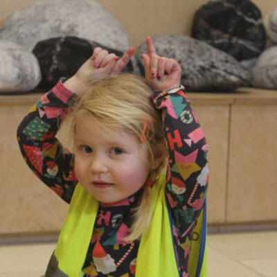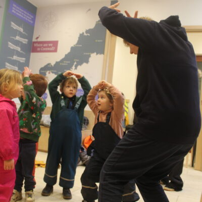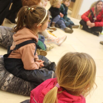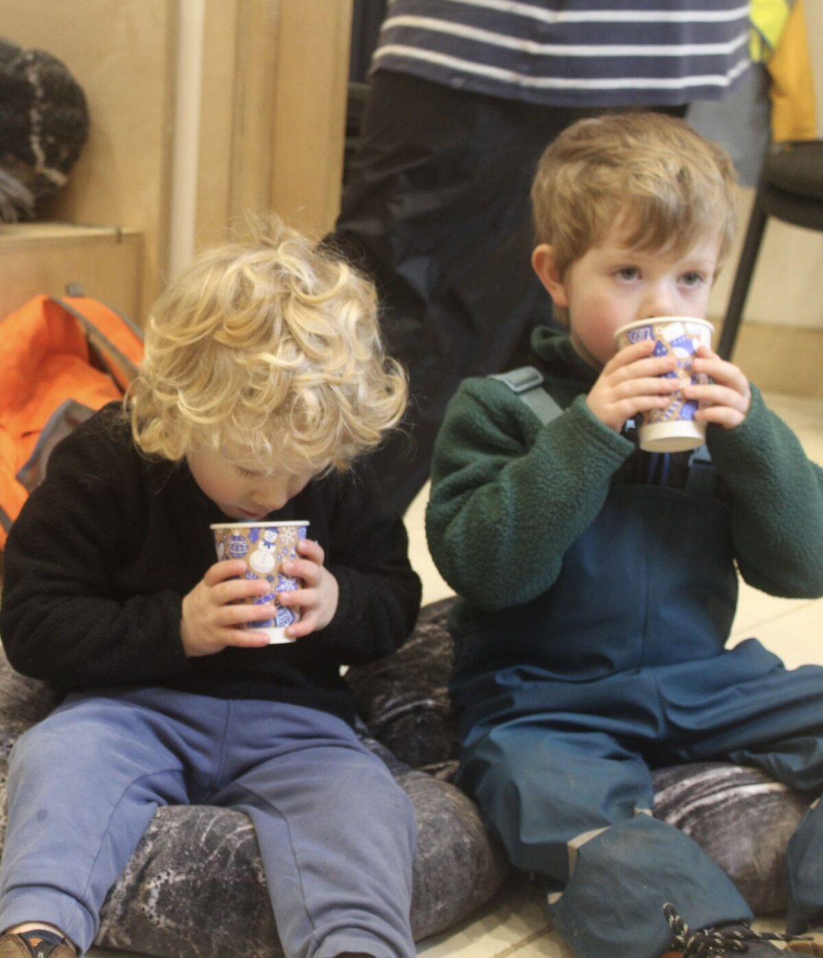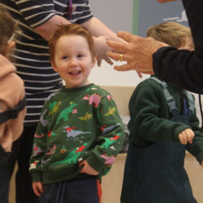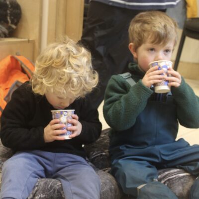 Next we went to the learning hub where we were treated to an oat milk hot chocolate which was delicious! After this Kerry told us the story of Cormoran the giant and the children joined in with actions (including making bunny ears that showed numbers!) and we even acted out the story when Kerry told it to us for a second time! They were fantastic actors and actresses! Kerry handed around Jack’s horn to show the children and they handled it very carefully and she blew it gently and the sound mesmerised the children.