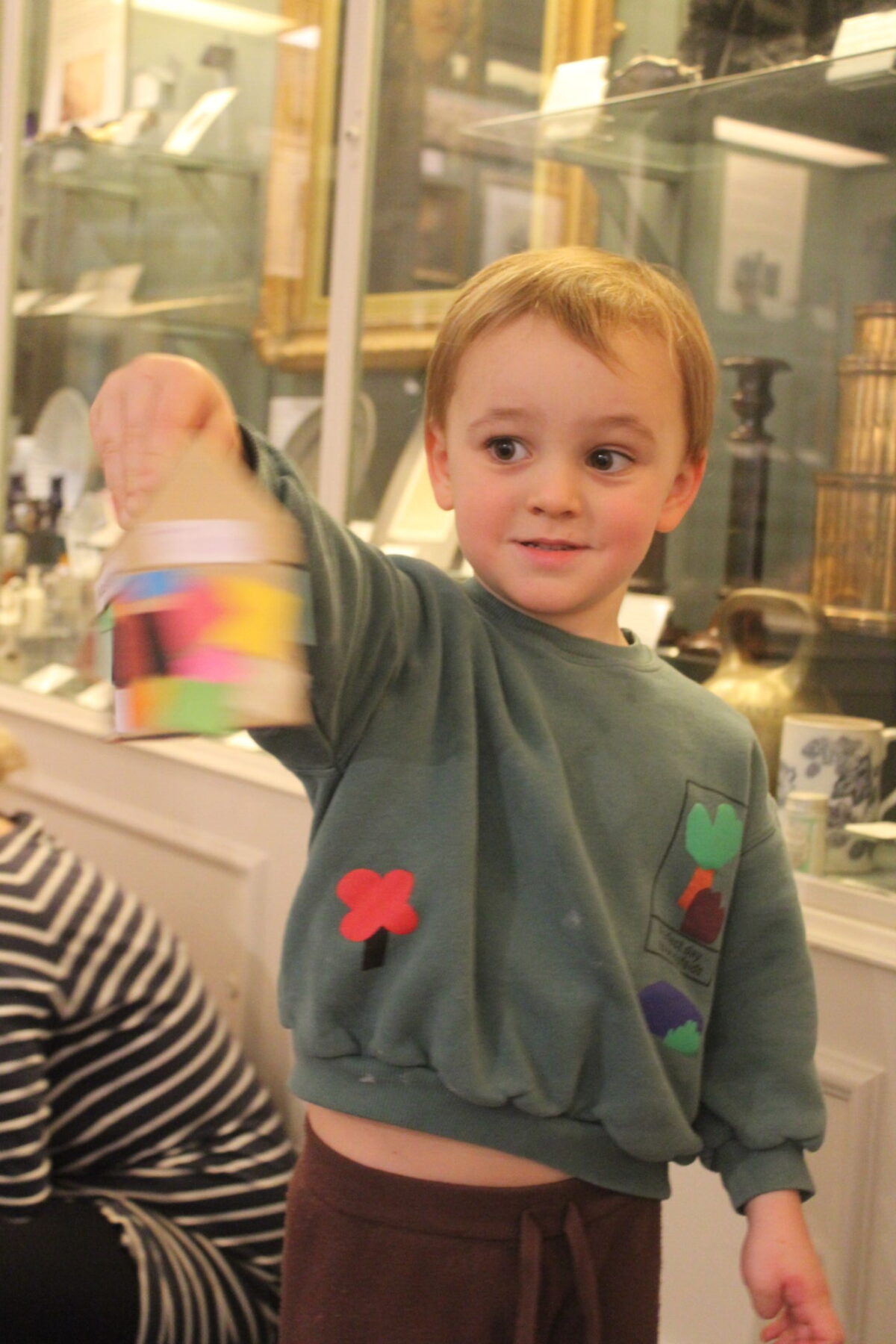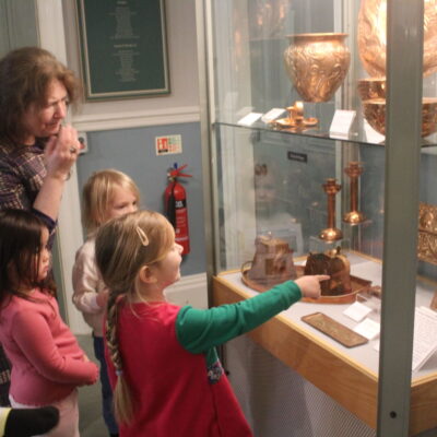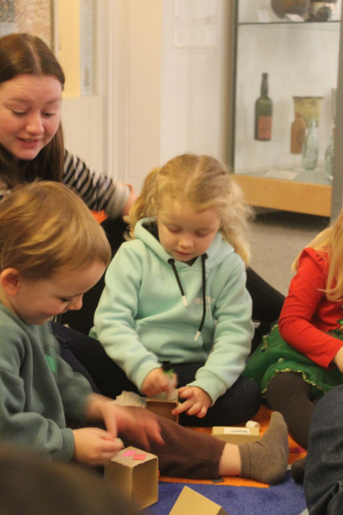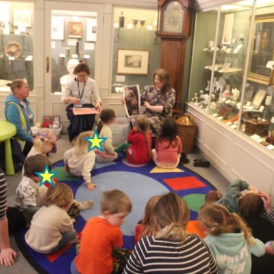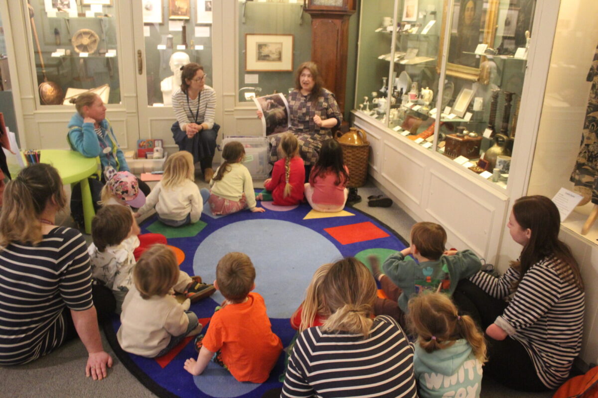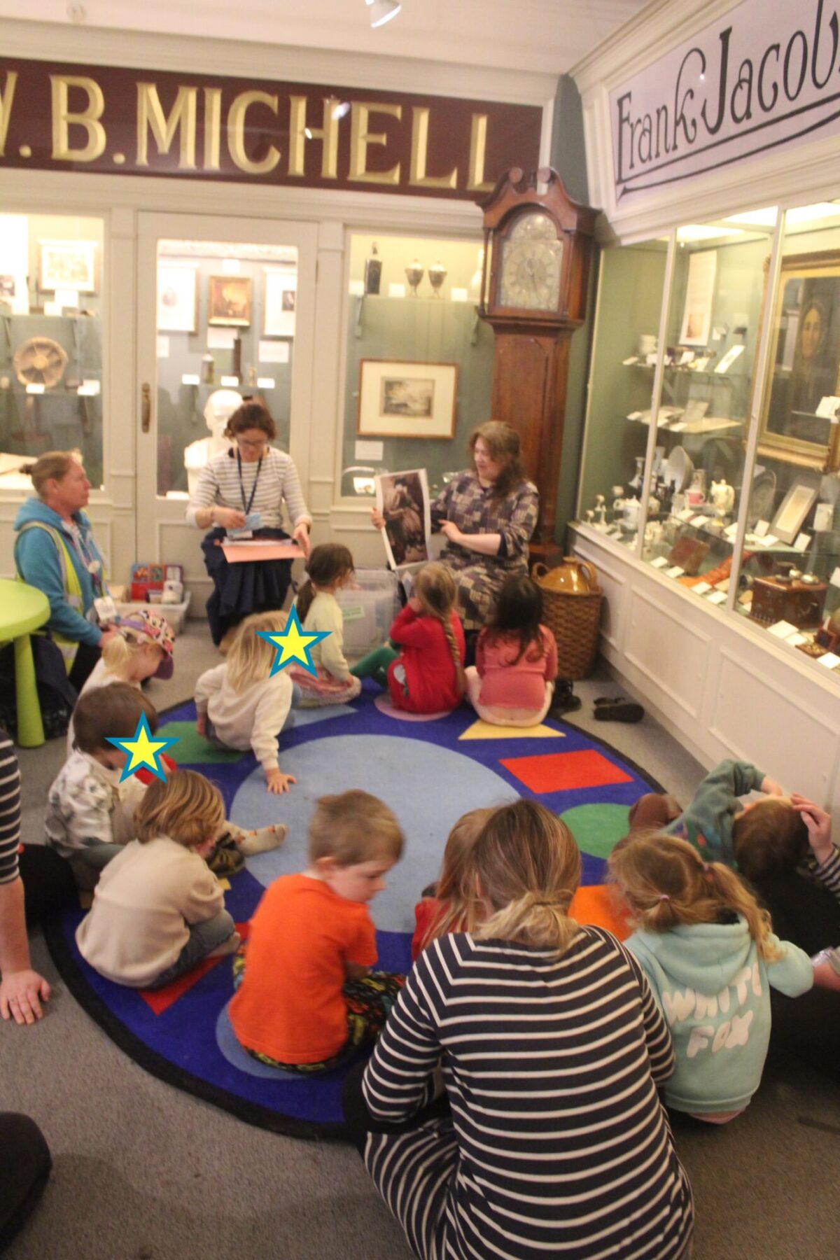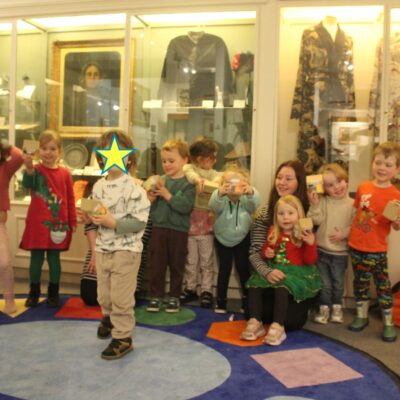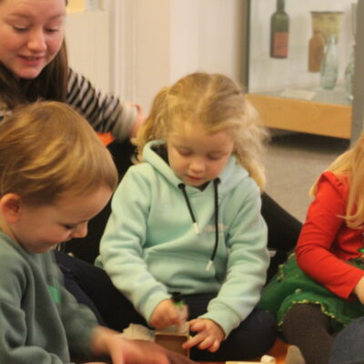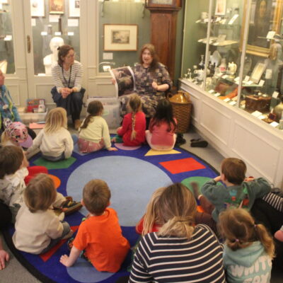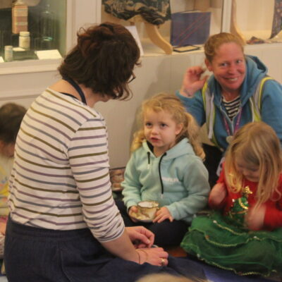 Katie and Jo welcomed us to the museum where we hung up our coats and climbed the spiral staircase to the museum rooms upstairs. We sat as a group on the shape mat and Katie and Jo asked the children what they could remember from our workshop last week. We were very impressed with the children’s memory, they remembered all about the hot water bottle to warm a bed, and the glass fizzy pop bottle too. They also remembered about the two paintings that we’d looked at and talked about. We then handled some new artefacts such as a precious porcelain cup and saucer and a copper bowl and talked about what they were made from and how delicate the porcelain was.
