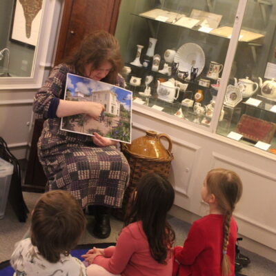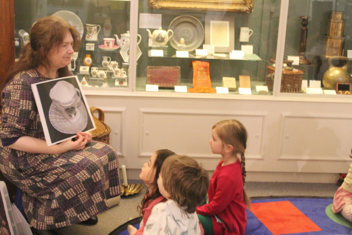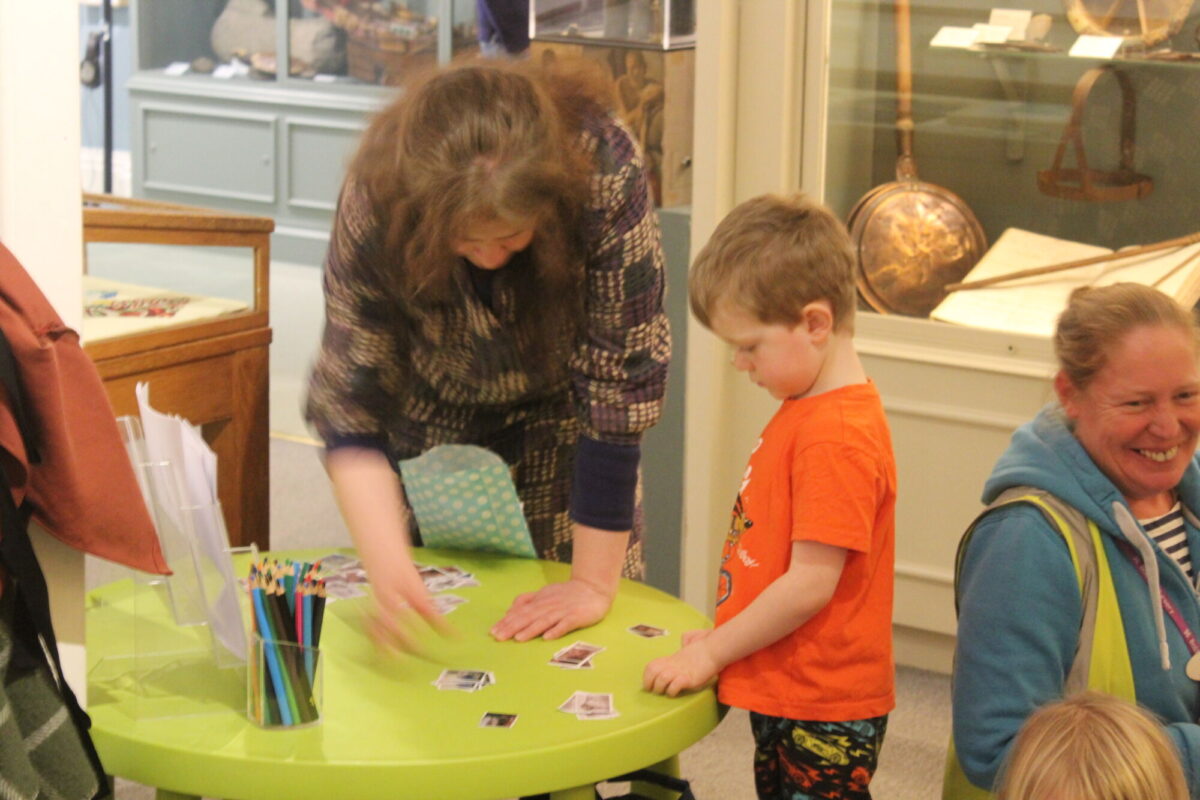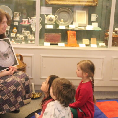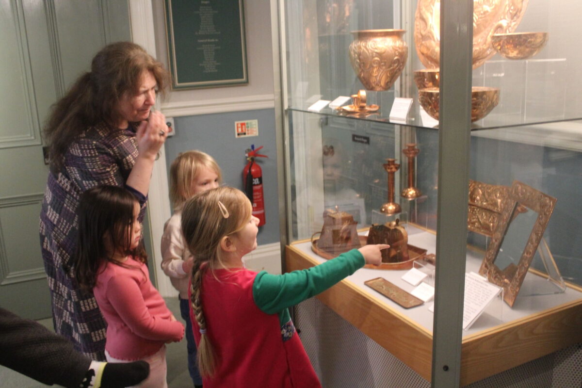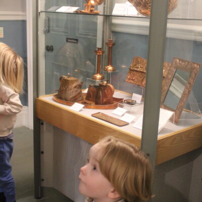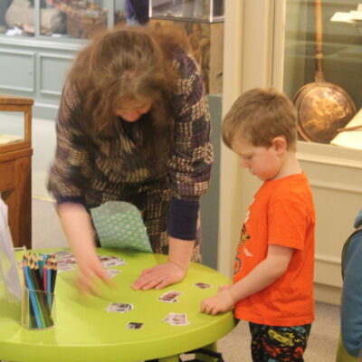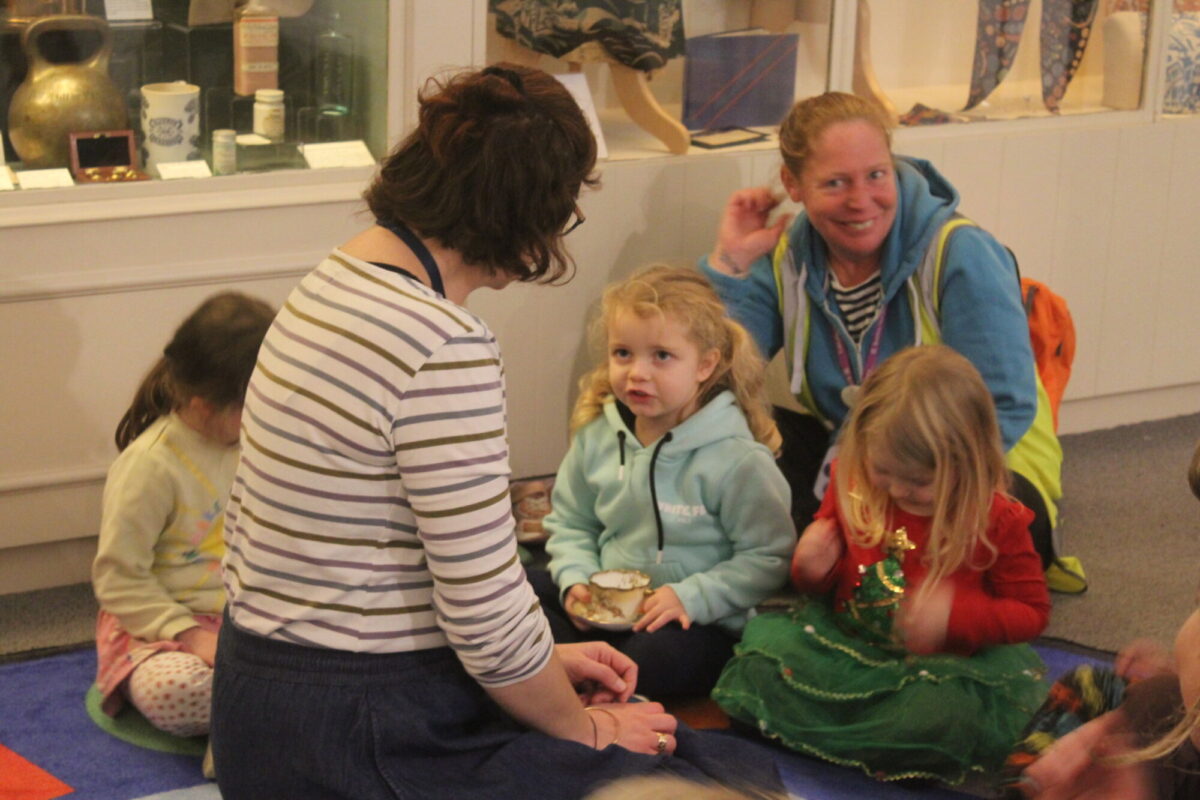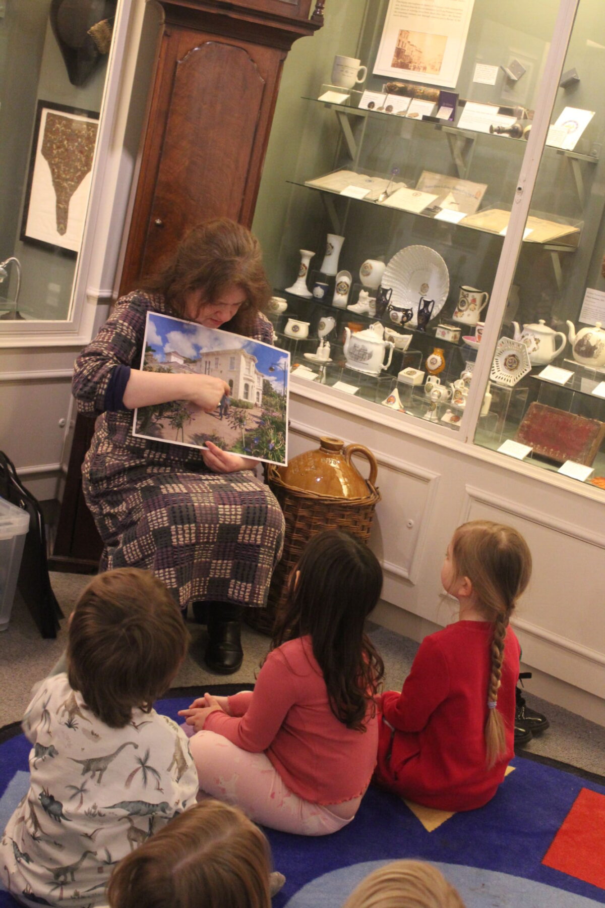 Katie and Jo welcomed us to the museum where we hung up our coats and climbed the spiral staircase to the museum rooms upstairs. We sat as a group on the shape mat and Katie and Jo asked the children what they could remember from our workshop last week. We were very impressed with the children’s memory, they remembered all about the hot water bottle to warm a bed, and the glass fizzy pop bottle too. They also remembered about the two paintings that we’d looked at and talked about. We then handled some new artefacts such as a precious porcelain cup and saucer and a copper bowl and talked about what they were made from and how delicate the porcelain was.