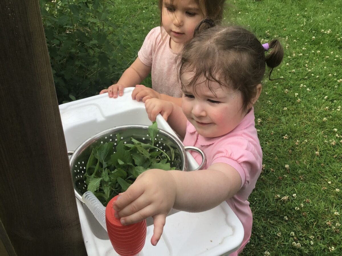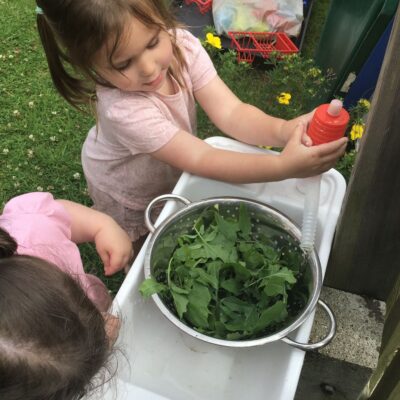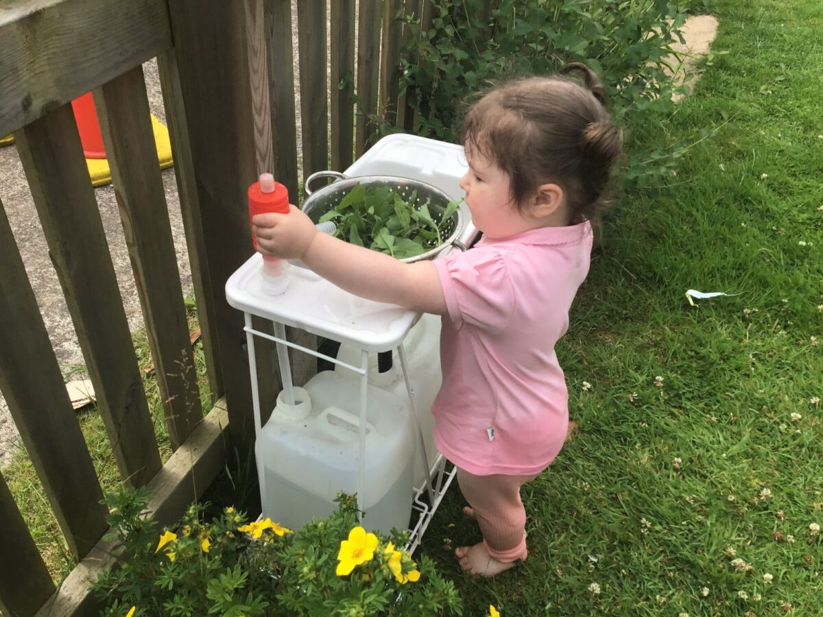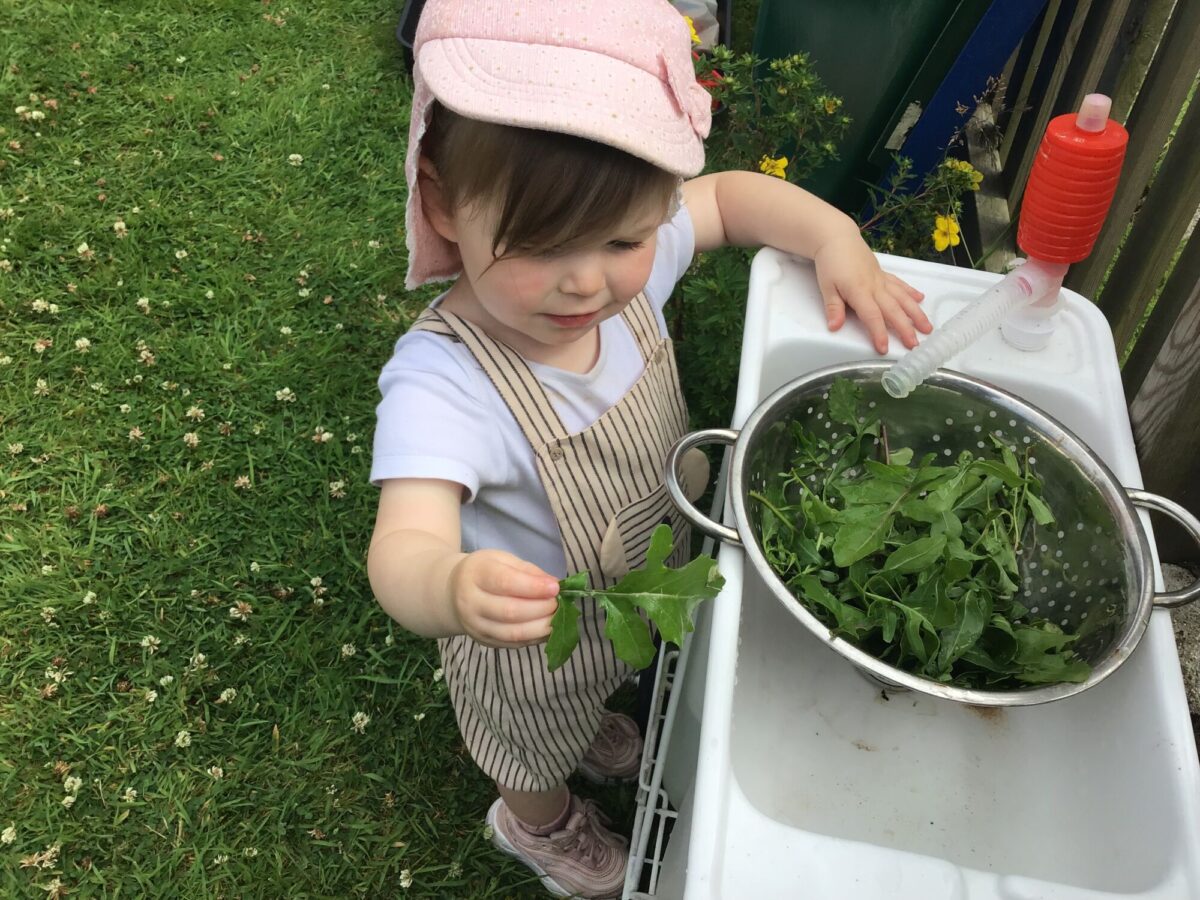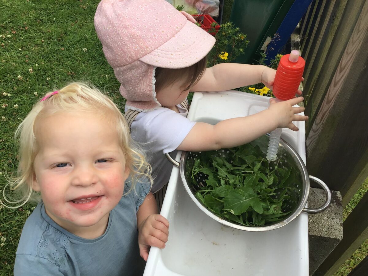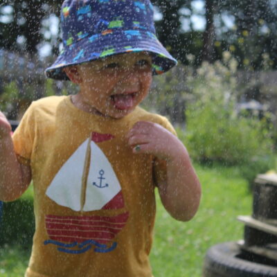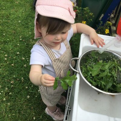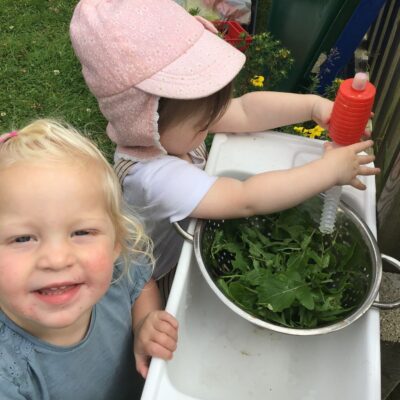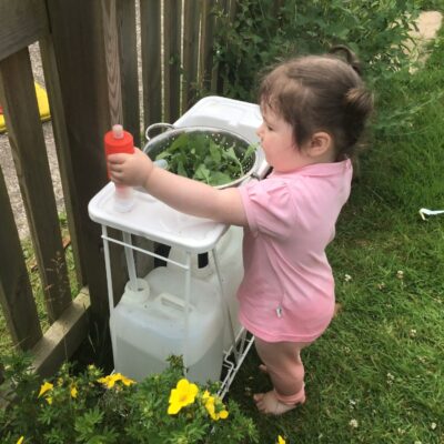We love washing our herbs in our garden sink! Exploring the scents of herbs is really exciting. We love feeling the whoosh of sliding down our slide and using all our muscles to climb back up the slope to slide down again! We love creating dens to cool down in the shade. We develop our balancing skills on our balance pebbles and pirate ship. We develop our coordination and fine motor strength and control manipulating tools in the sandpit. We also cool down in the spray of the water hose!