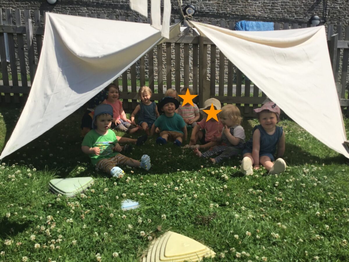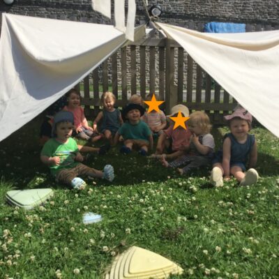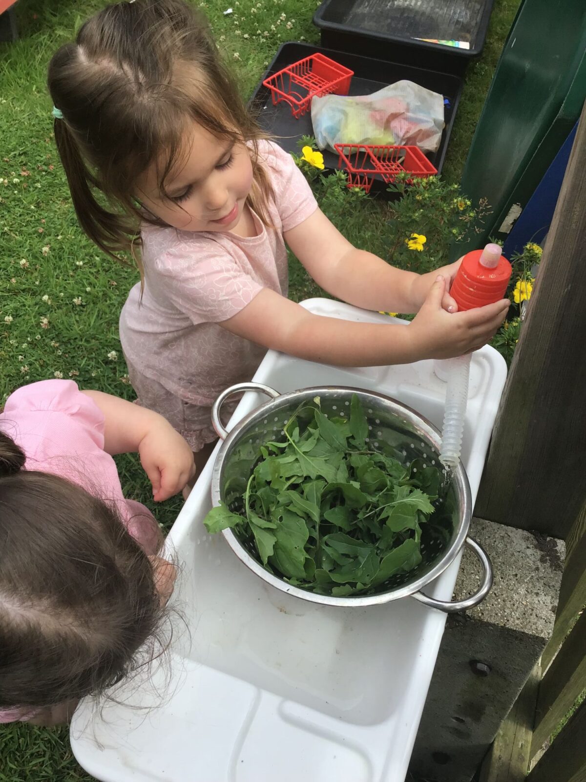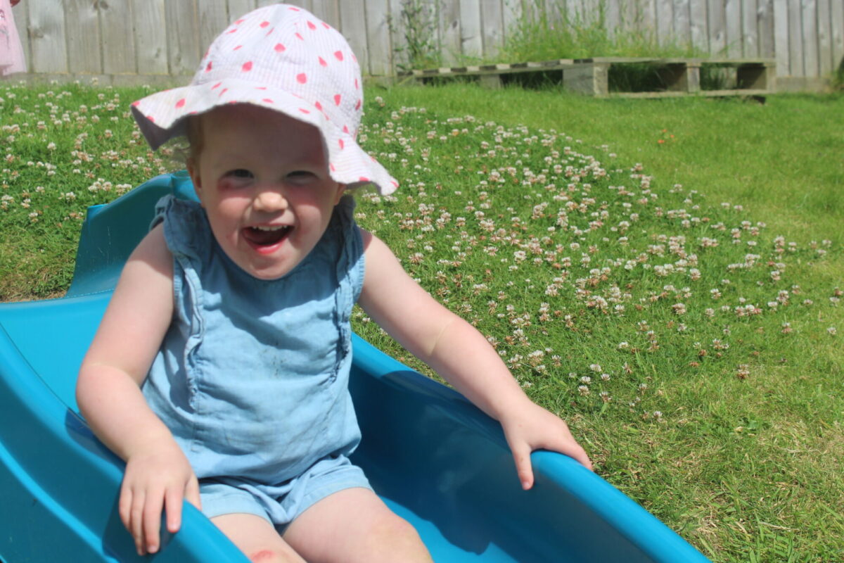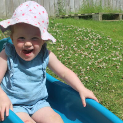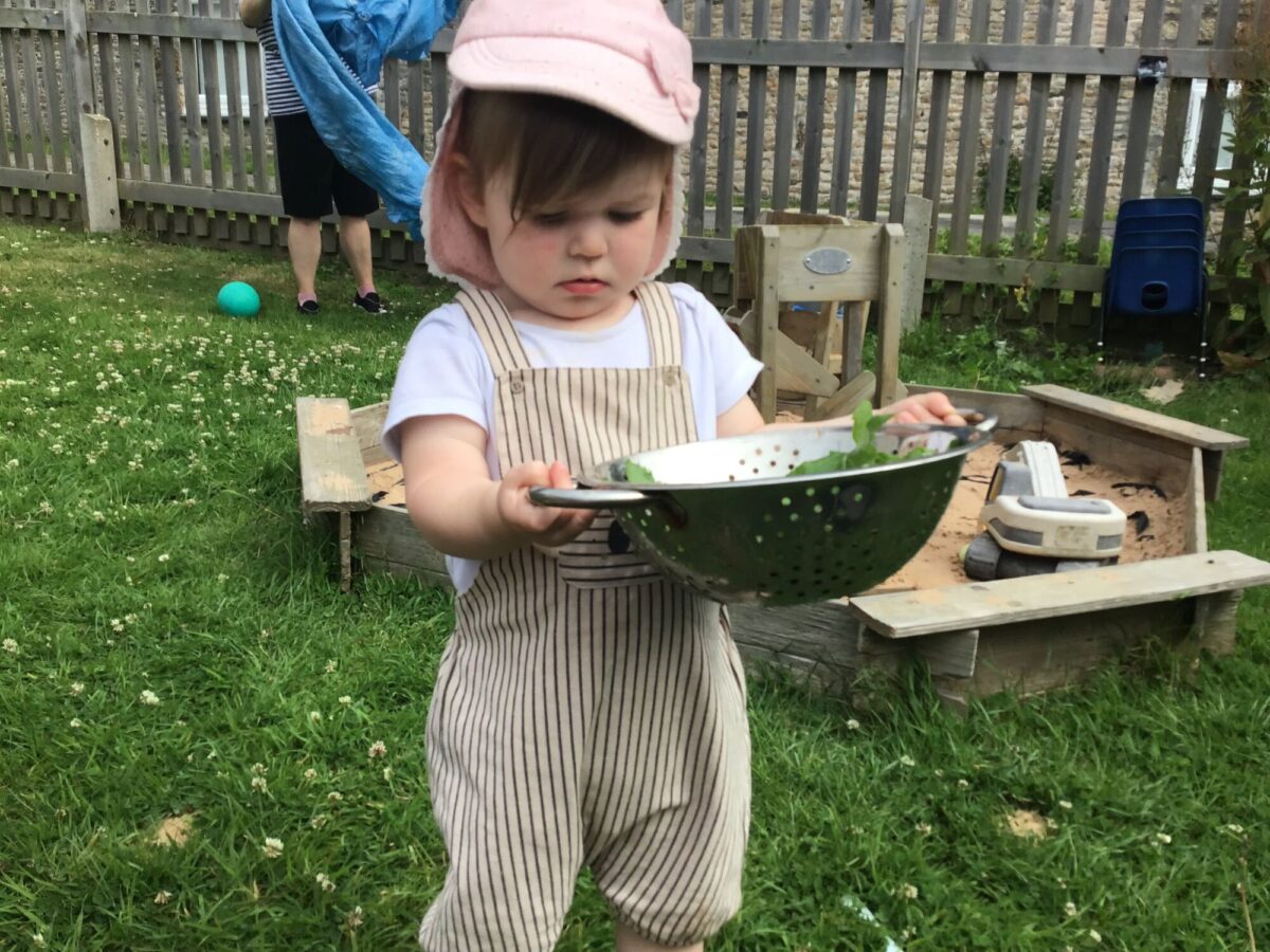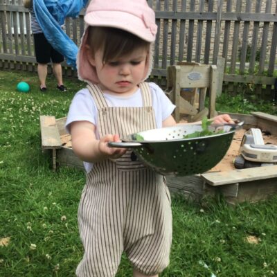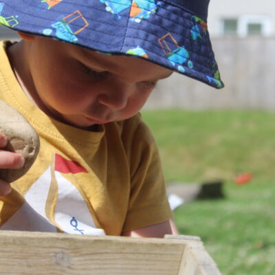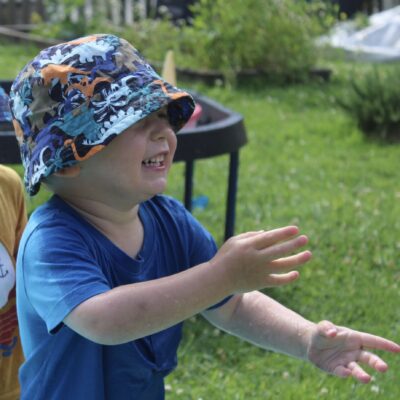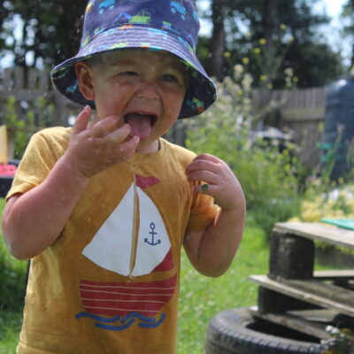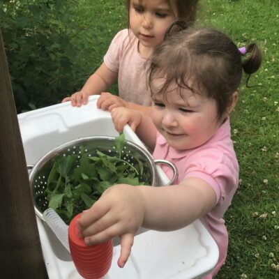 We love washing our herbs in our garden sink! Exploring the scents of herbs is really exciting. We love feeling the whoosh of sliding down our slide and using all our muscles to climb back up the slope to slide down again! We love creating dens to cool down in the shade. We develop our balancing skills on our balance pebbles and pirate ship. We develop our coordination and fine motor strength and control manipulating tools in the sandpit. We also cool down in the spray of the water hose!