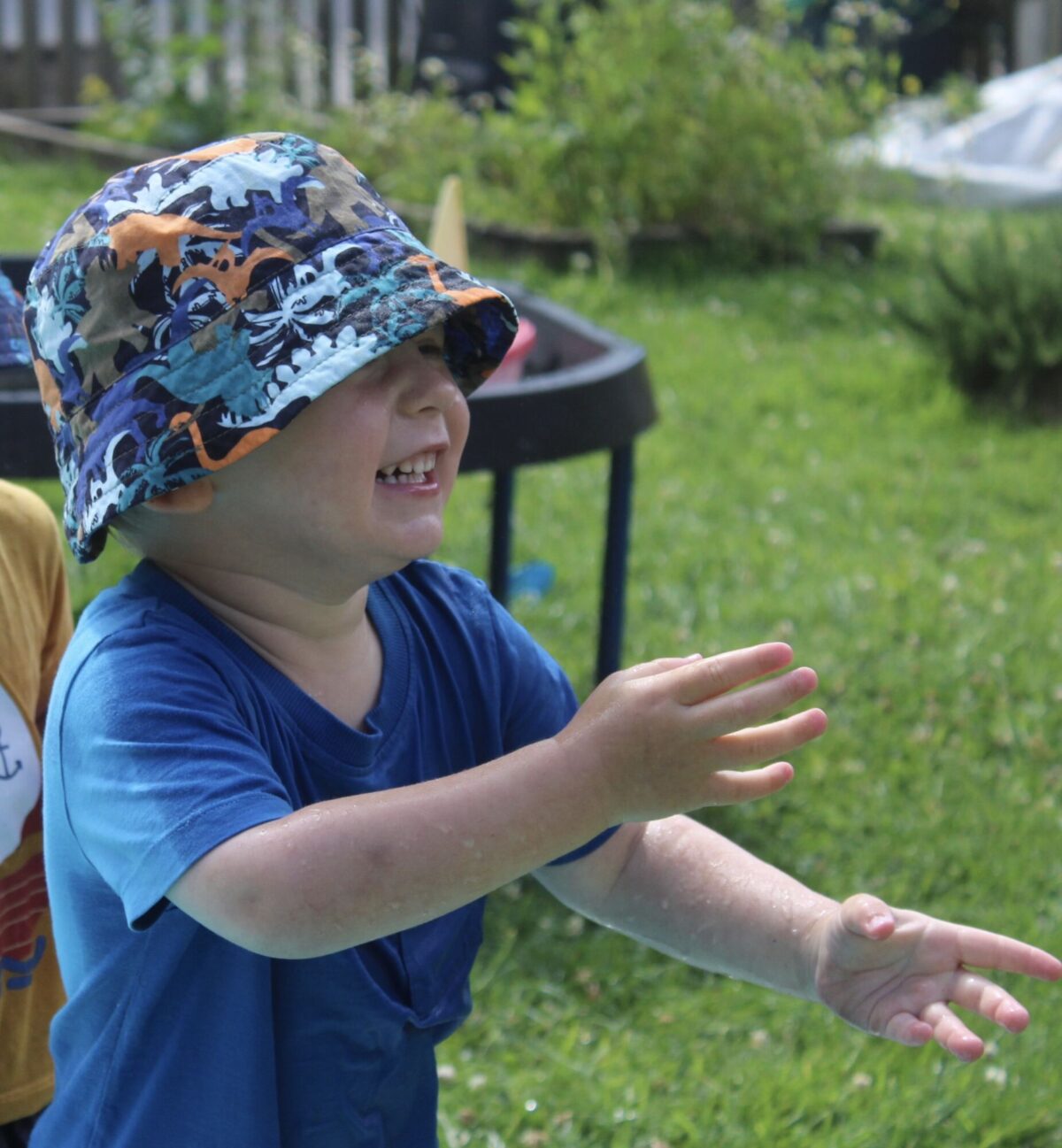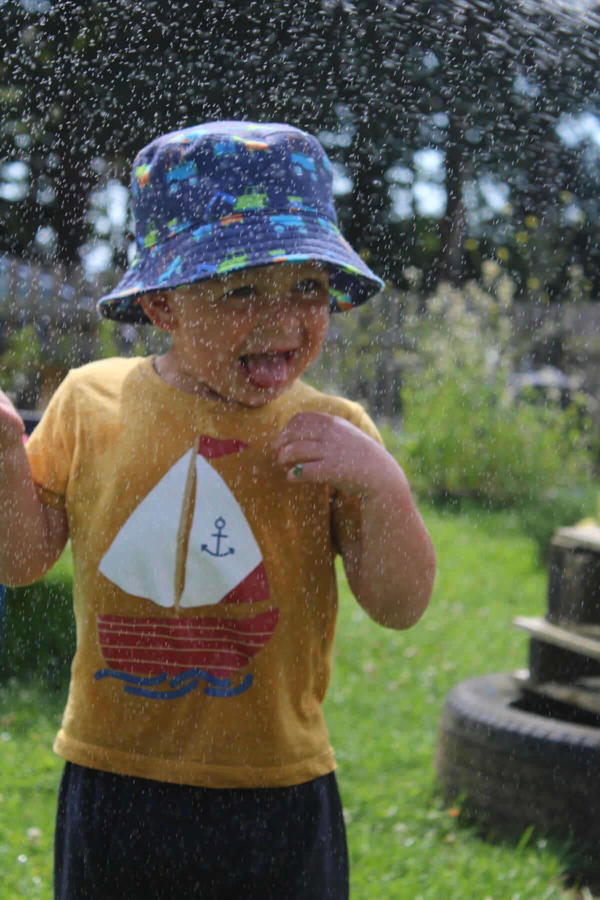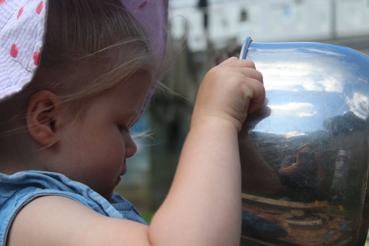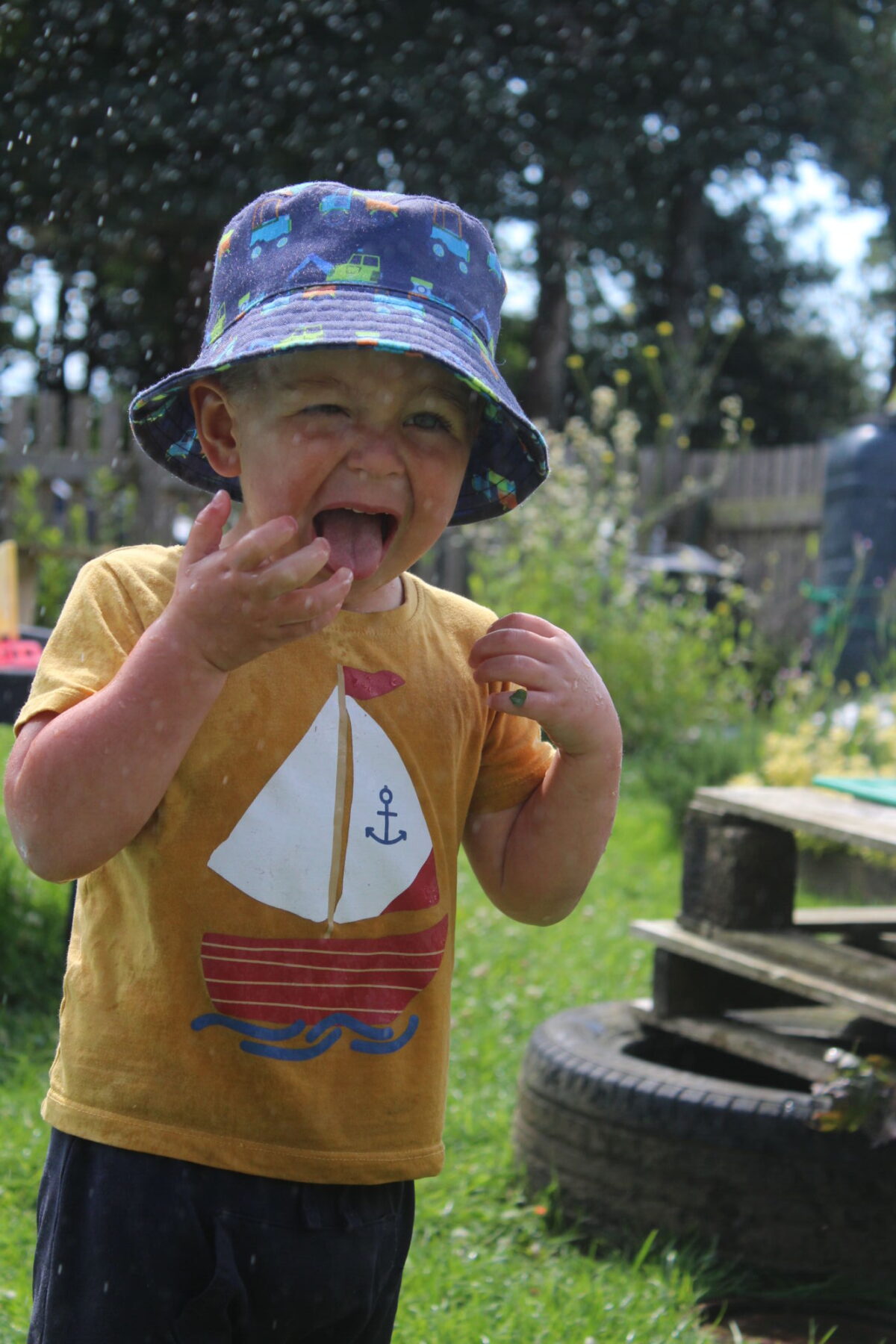 We love washing our herbs in our garden sink! Exploring the scents of herbs is really exciting. We love feeling the whoosh of sliding down our slide and using all our muscles to climb back up the slope to slide down again! We love creating dens to cool down in the shade. We develop our balancing skills on our balance pebbles and pirate ship. We develop our coordination and fine motor strength and control manipulating tools in the sandpit. We also cool down in the spray of the water hose!