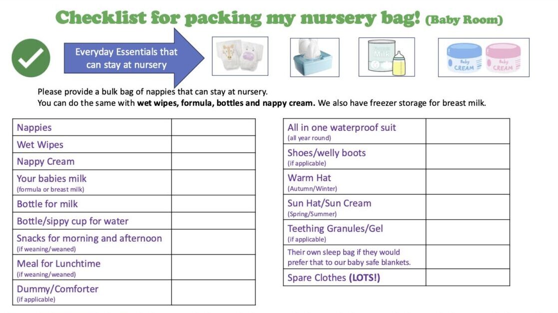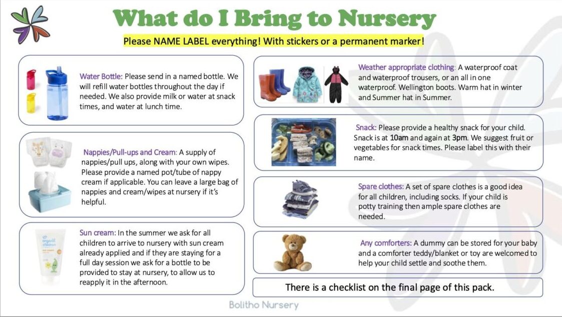 Before your child’s first day, you will be invited to a settling meeting with your child’s key person. This is a chance for us to get to know you and for you to get to know us. Once per term we also set up a getting to know you meeting for our new families that term to meet each other and to meet our staff team again and ask any questions about your upcoming settling. We then start your settling sessions with a short half an hour session and working up to one hour, two hours etc, tailored to your family. Here are a few pages from our Family Welcome Pack that are particularly relevant to your child’s first day!